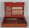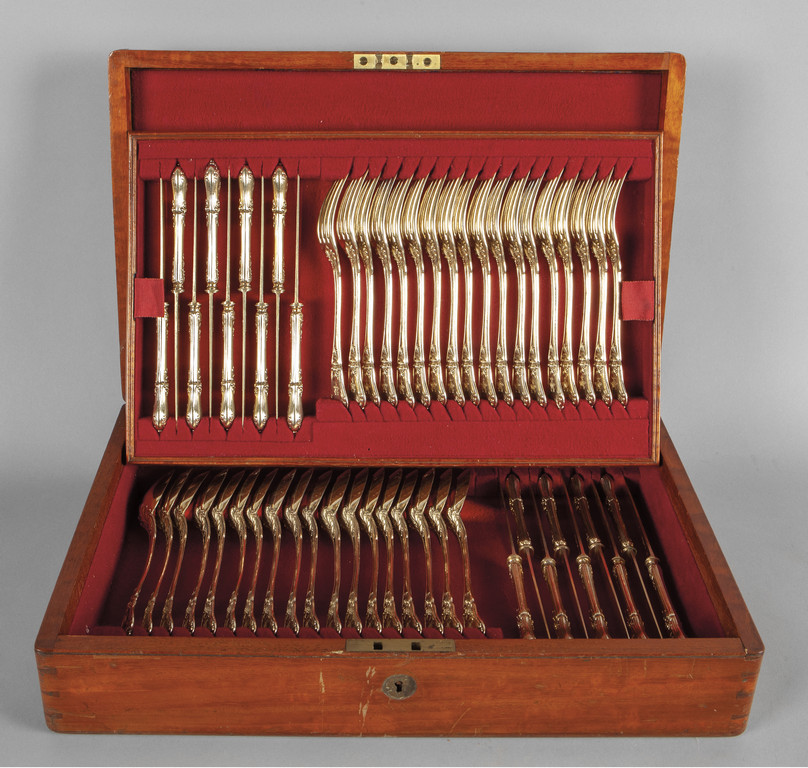 Servizio di posate in argento vermeille finemente sbalzato con stemma nobiliare composto da: 18 forchette 18 coltelli e 18 cucchiai nella loro scatola