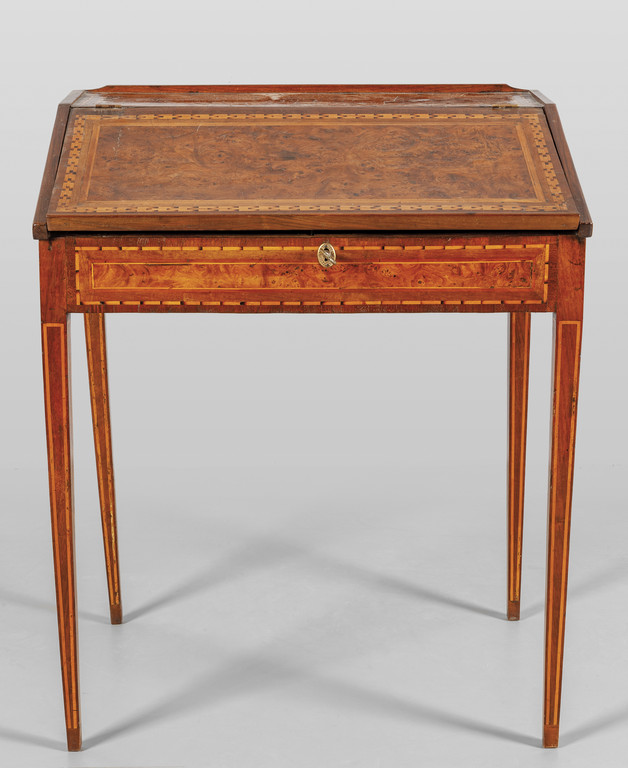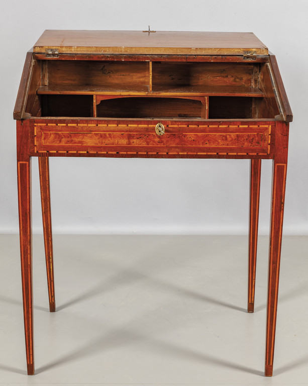 Piccolo scrittoio Luigi XVI da centro lastronato in radica di noce e filettato fine sec.XVIII
