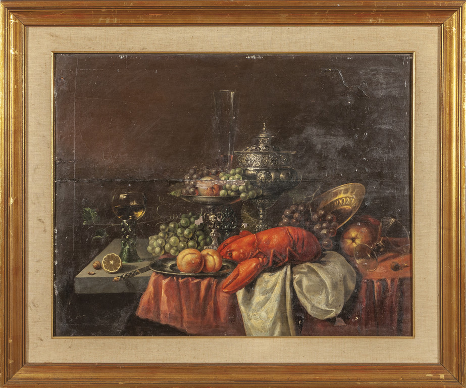 Scuola fiamminga 'Tavola riccamente imbandita' olio su tavola