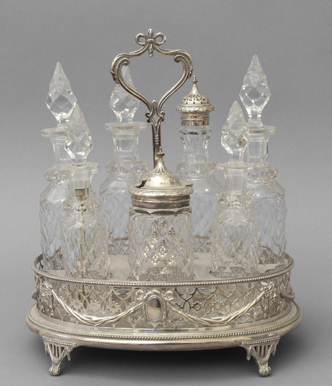 Set da tavola in metallo argentato e cristallo Inghilterra sec.XX e coppia di candelieri in metallo argentato
