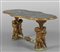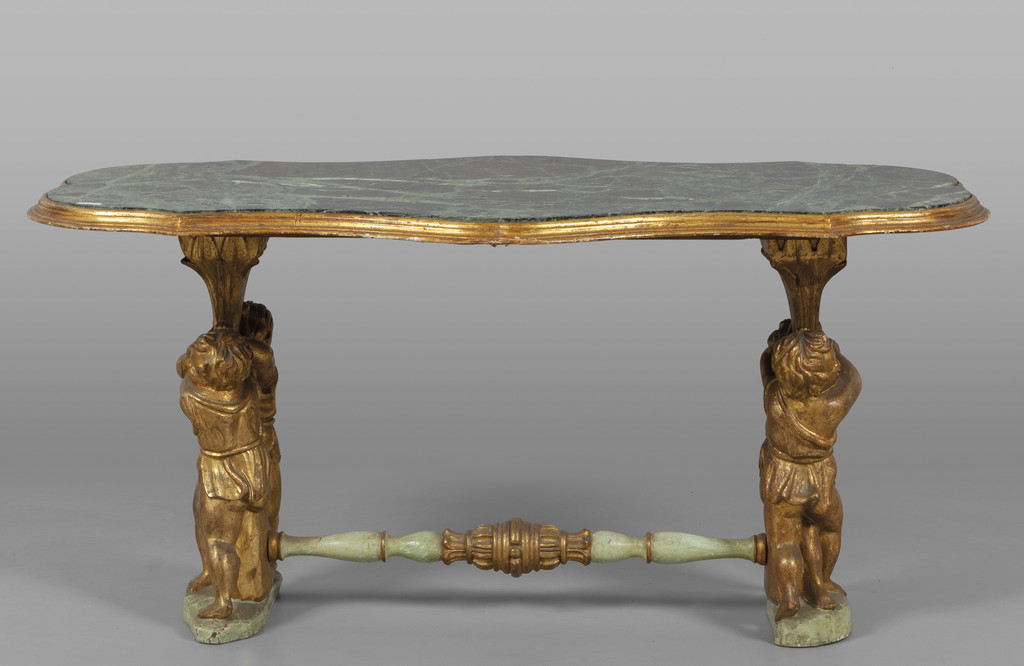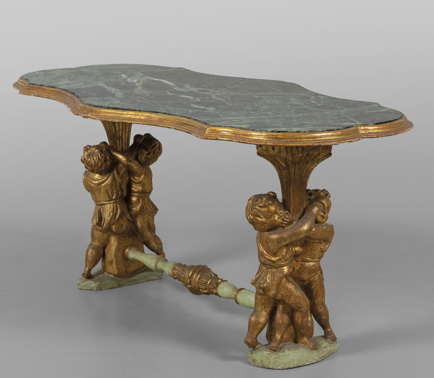 Tavolino da sofà in legno intagliato e dorato con gambe con putti che si abbracciano sec.XX piano in marmo (rotture)