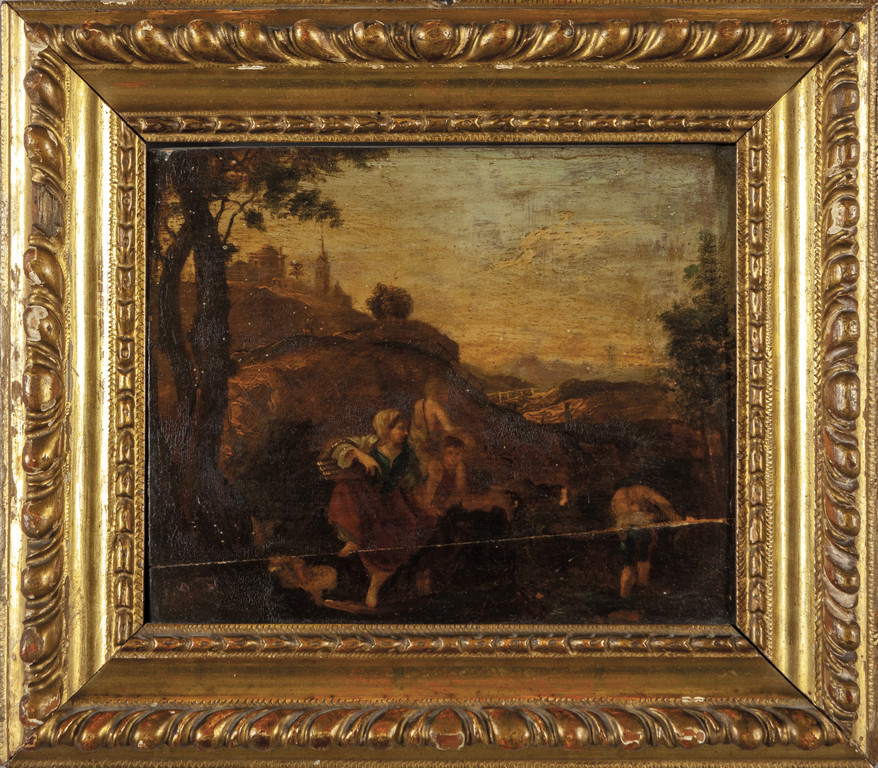 Scuola fiamminga sec.XVII (Cornelis van Poelenburgh) 'Scena campestre' olio su tavola