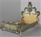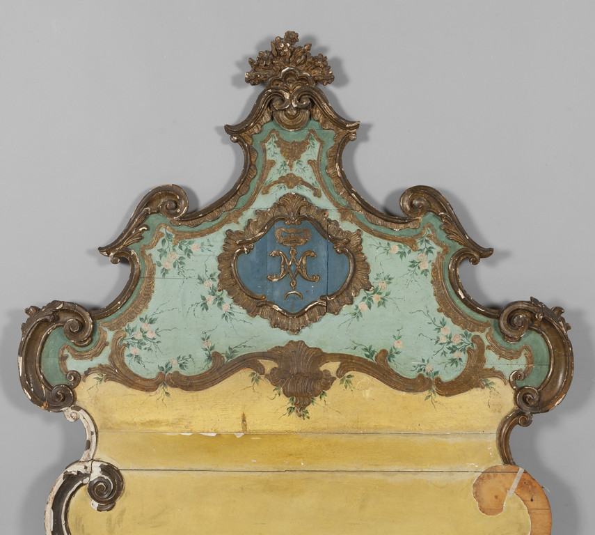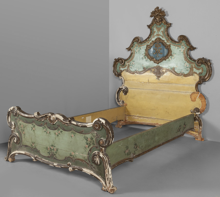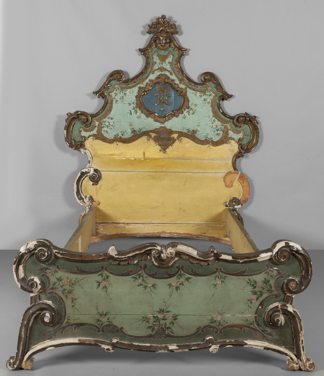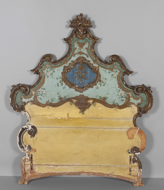 Testata di letto in legno intagliato e dipinto Genova metà sec.XVIII montata su struttura di letto del sec.XIX