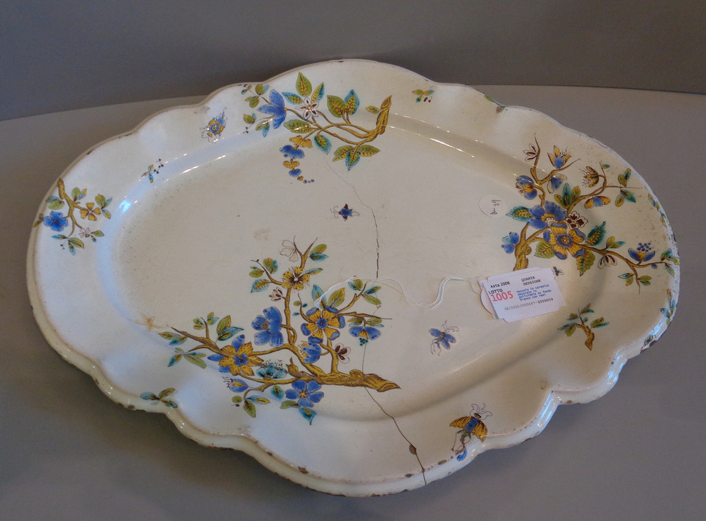 Vassoio in ceramica decorato in policromia su fondo bianco con rami fioriti inizi sec.XIX