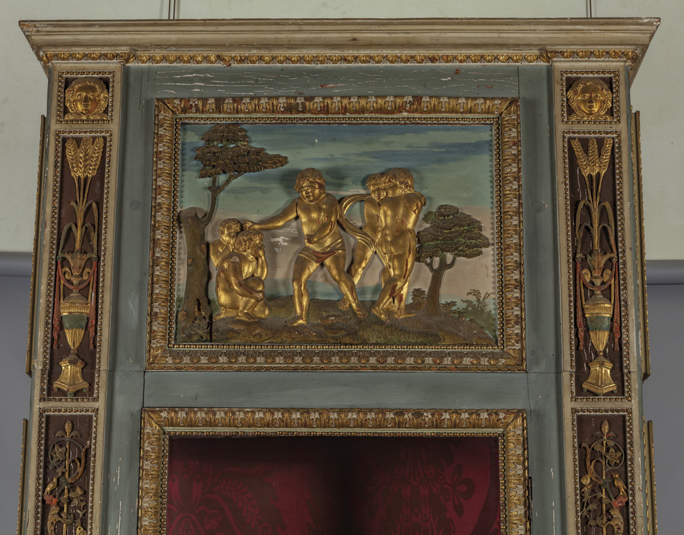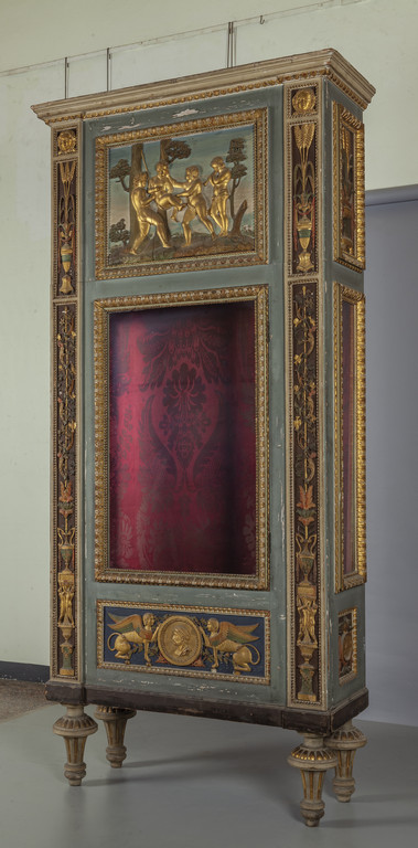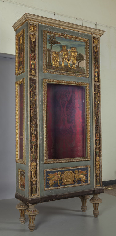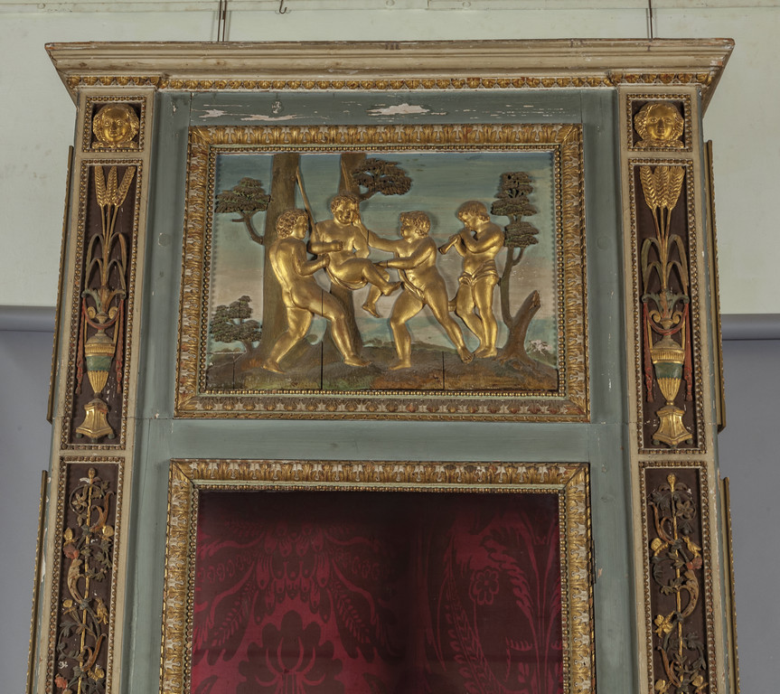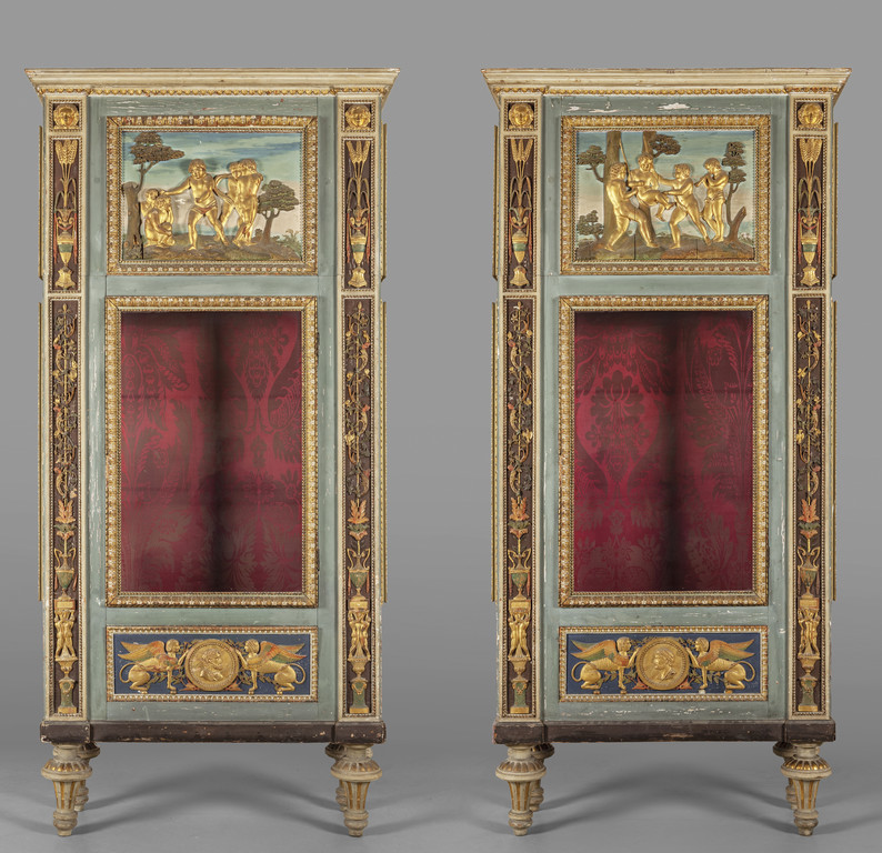 Coppia di vetrine neoclassiche in legno finemente intagliato dorato e laccato composte con elementi della fine del sec.XVIII