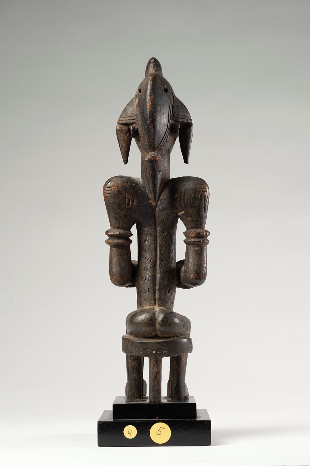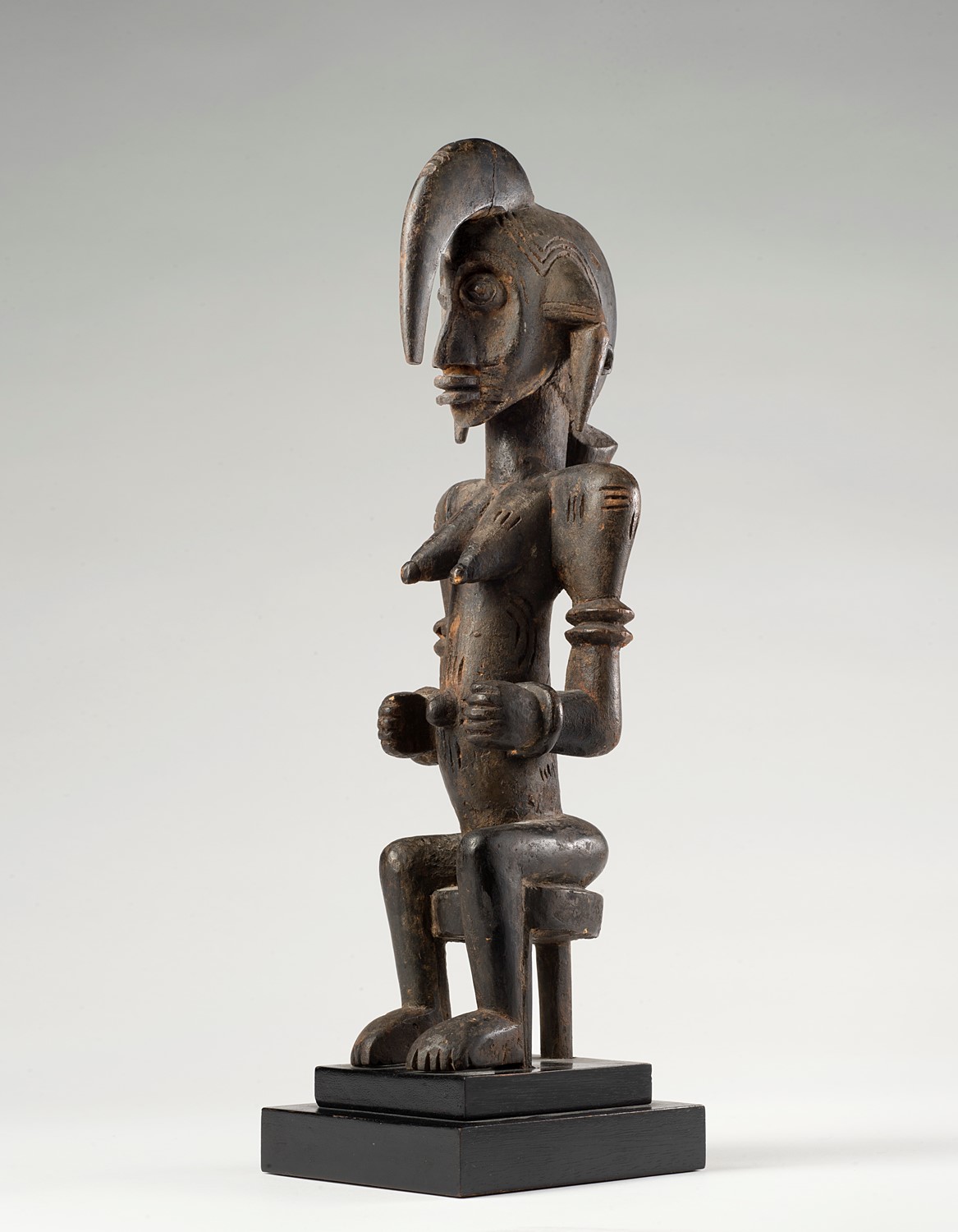 Esemplare raro nella rappresentazione stilistica dei Senufo di Korhogo. Katiéléo rappresenta la figura di una antenata primordiale del pantheon Senufo. Evoca la madre divina che detiene un ruolo sacro ed essenziale nella mitologia di questo gruppo. Si conoscono alcuni esemplari di figure simili che, sedute sul seggiolino, allattano un figlio.Le loro dimensioni raggiungono il metro di altezza. Qui la figura femminile di 33 cm è appoggiata seduta su un seggiolino a gamba unica. Il volto è parzialmente nascosto da un’esagerata ciocca di capelli che scende sul grosso naso: una caratteristica di queste opere. Occhi a bulbo e labbra piatte sporgenti segnano la geometria della faccia. I seni abbondanti sono un auspicio di fertilità. Le braccia staccate dal tronco, piegate sul ventre, sono abbellite con bracciali ai polsi e agli avambracci. La scultura è realizzata con una serie di volumi pieni che si alternano a vuoti: un lavoro di abilità dello scultore che ha segnato il corpo con raffinate scarificazioni. Il legno è ricoperto con una densa patina dovuta ai continui trattamenti con sostanze oleose.