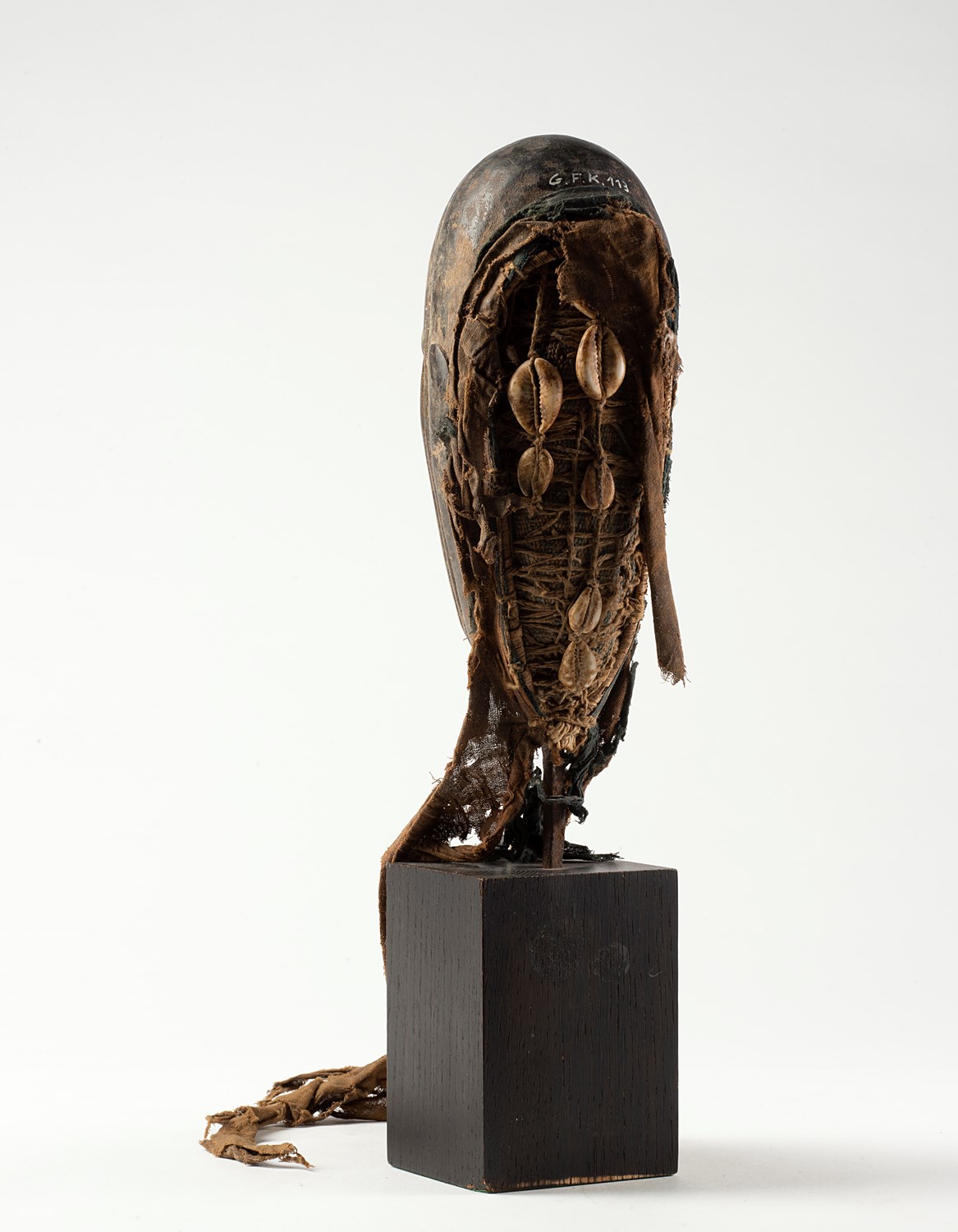 Maschera in miniatura ad uso divinatorio con la funzione di ricettacolo degli spiriti delle grandi maschere non più in uso. Nella parte posteriore è stato inserito un ricettacolo ripieno di sostanze a carattere magico chiuso con iuta e rifinito con una fila di Cypree. Un lungo ferro infisso sotto il mento serviva per piantare la maschera nel terreno per il suo utilizzo nei rituali di divinazione. Un lungo tessuto indigeno avvolge tutt'intorno la maschera.