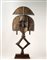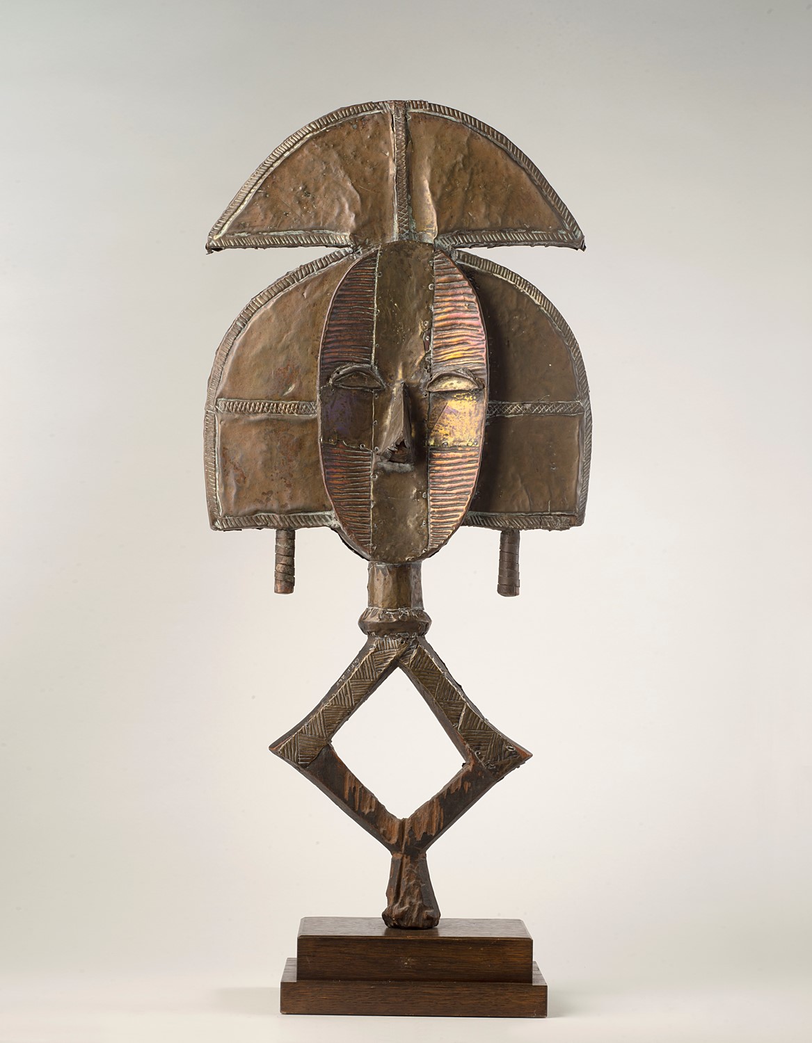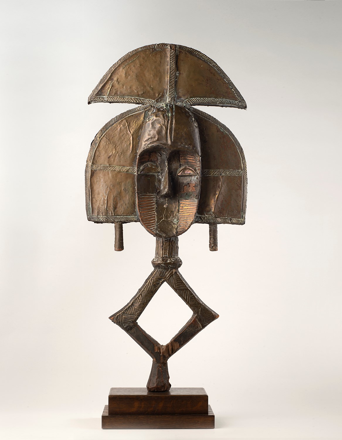 E’ un reliquiario Kota tipo Janus, cioè con due figure contrapposte che hanno in comune - nella parte inferiore - la sagoma a rombo. Rappresenta un modello raro nella tipologia Kota. Entrambi i lati sono rivestiti con lamine di rame. II lato concavo ha la forma di un ovale allungato con larghe strisce di ottone sugli assi mediani. Nella zona centrale sporge il naso ad angolo diedro. Le decorazioni sottolineano tutto il profilo della sagoma. Il viso è rivestito con lamine di rame a motivo di lamelle figurate. I pendenti sono invece ricoperti con sottili spirali di rame.Il lato convesso si caratterizza per il rilievo della fronte - divisa dalla linea sagittale - dove le arcate delle sopracciglia, dalla radice del naso, riprendono la sagoma degli occhi. La mancanza della bocca sarebbe un indice di rarità. In origine le parti metalliche sono state fissate con chiodi di rame e, lungo i bordi, con linguette di ferro. Tutta la struttura evidenzia, sia nelle parti metalliche, che nel legno, rotture e abrasioni, dettagli che segnalano l’ indiscussa anzianità di quest’opera.