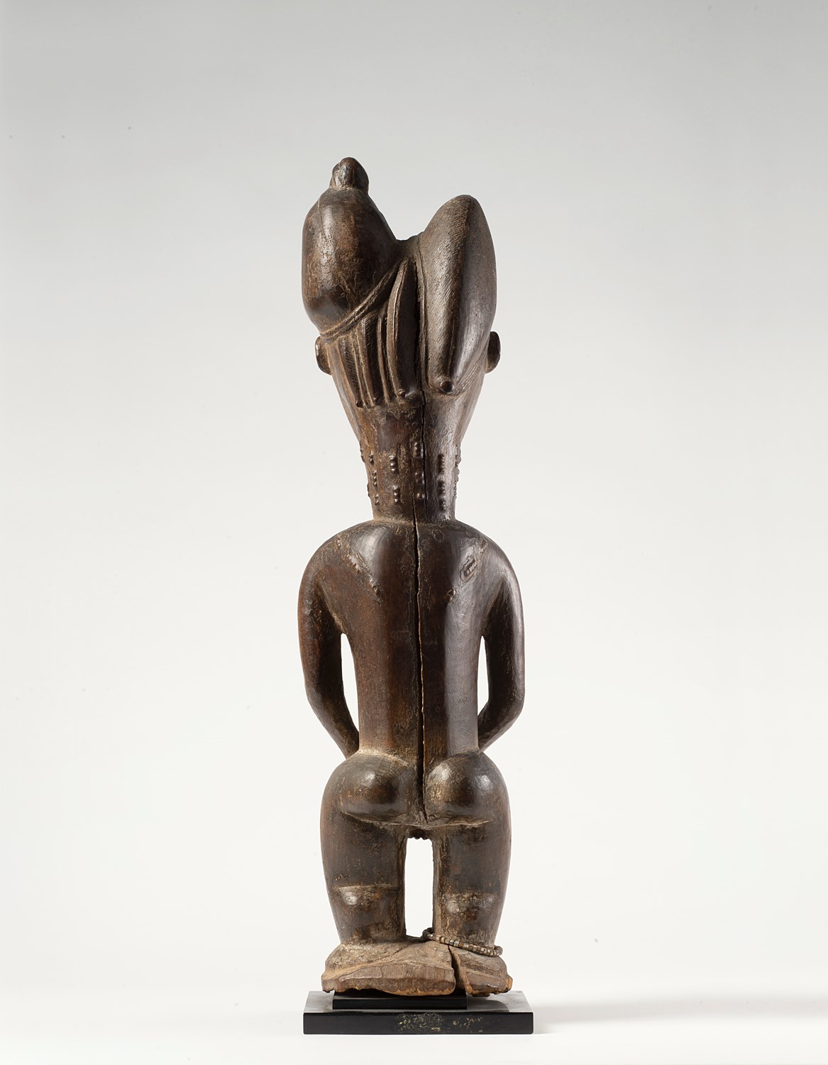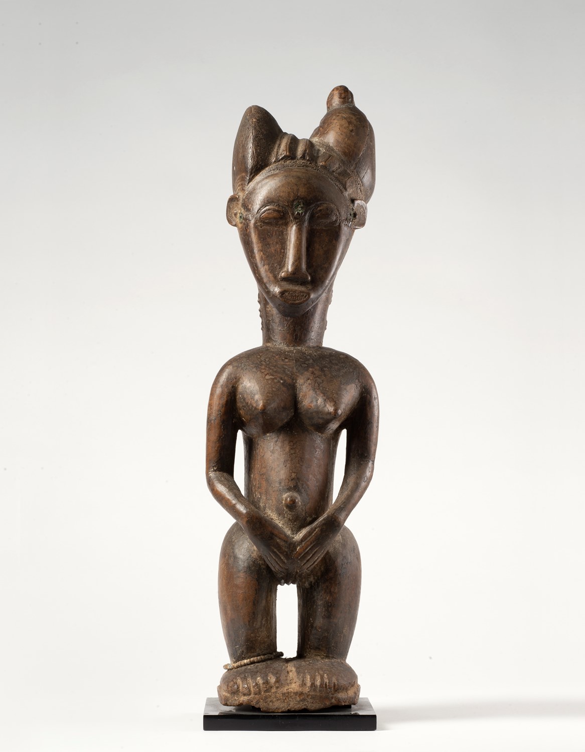 Rappresenta una figura femminile con pettinatura costituita da due grandi ciocche differenti una dall'altra, un dettaglio che identifica i grandi maestri Baulé. Questo esemplare testimonia uno stile insolito dell’arte Baulé perché la figura è scolpita a volumi pieni. Si presenta in posizione frontale con i piedi che appoggiano su un piedistallo circolare. Le braccia sono staccate dal corpo ed il volto si innesta sul collo possente. Le mani appoggiate al ventre riprendono un gesto che i Baulé considerano un segno di pace: si ritrova in quasi tutte le figure Baulé scolpite in posizione verticale. Una bella patina scura testimonia un lungo utilizzo nel tempo, confermato dall'usura del legno e dalle numerose tracce delle sostanze sacrificali. Alcuni tatuaggi sono presenti su collo e schiena. Un giro di perle di vetro circonda la gamba destra. Residui di ossido verde lasciato da tre bullette di rame che in origine erano state applicate su fronte e tempie.