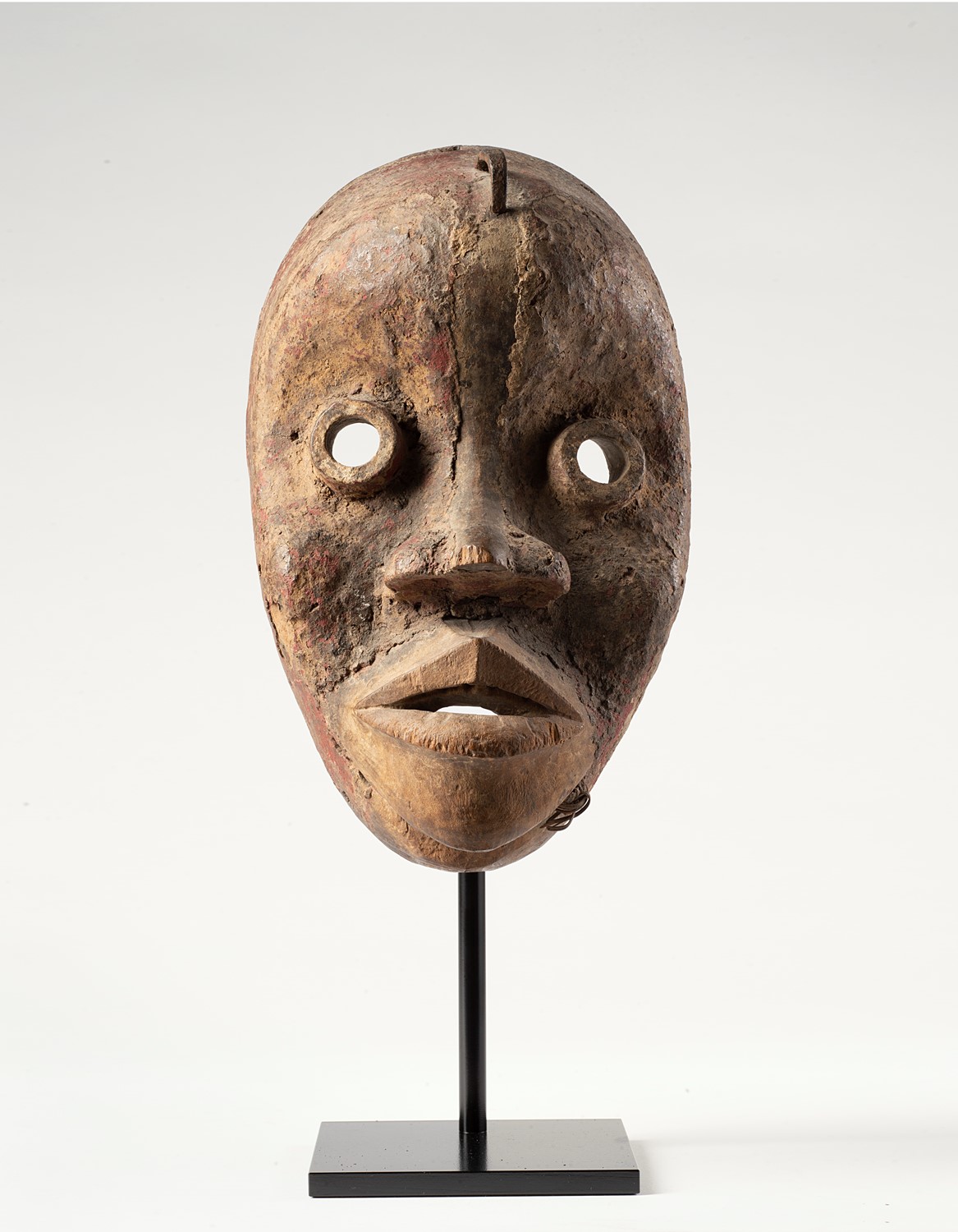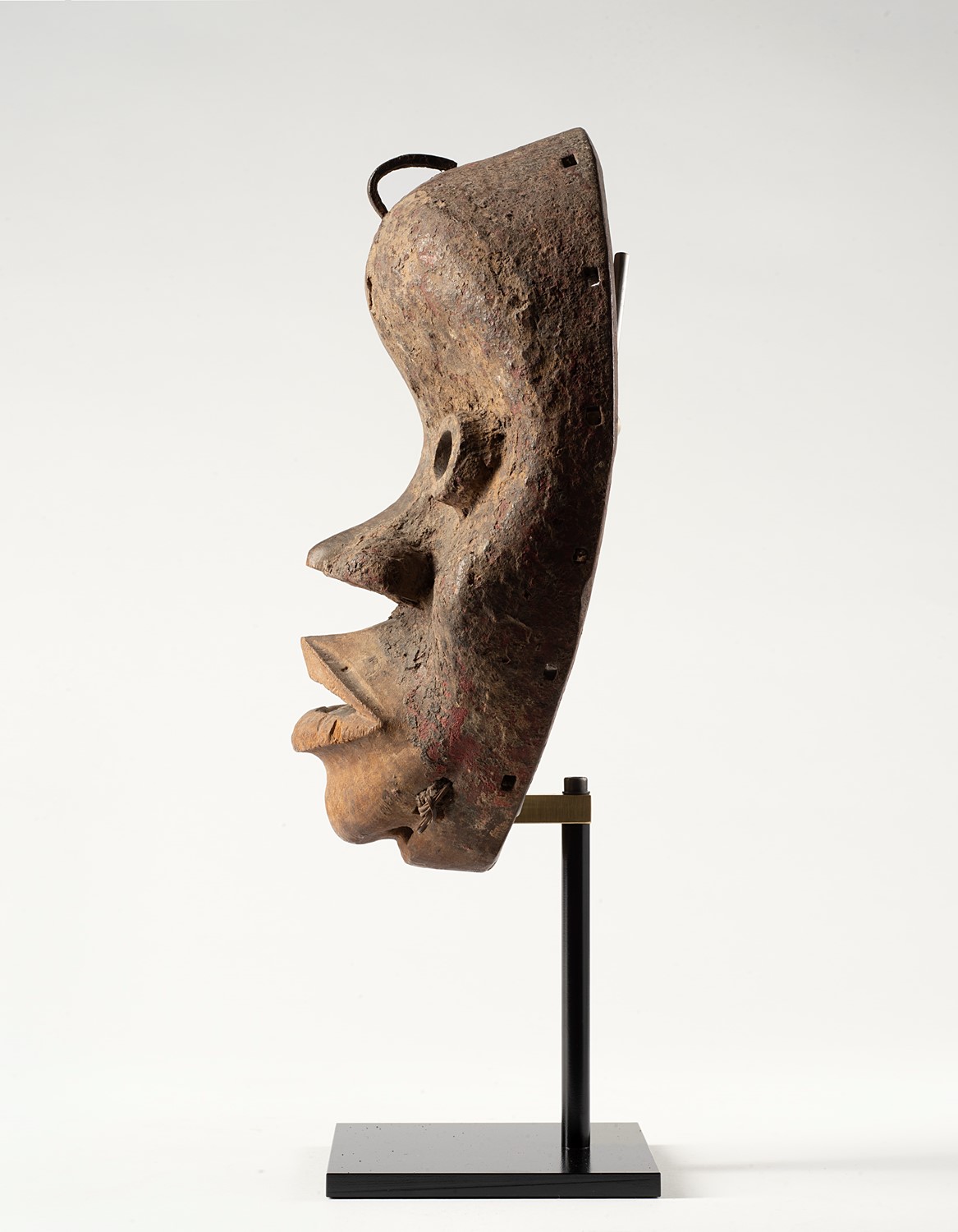 E’ scolpita in un atteggiamento che trasmette emozione. La bocca aperta sembra indicare una voce nell’atto di emettere un suono. La funzione di questa maschera era di proteggere il proprietario e la sua famiglia.La piattina di ferro infissa sulla fronte era un elemento importante nei rituali di divinazione: infatti, il proprietario, per attivare lo spirito che faceva da tramite tra il mondo dei vivi e l’aldilà, al momento di chiedere la sua protezione, cospargeva tutt'intorno al ferro un impasto di sostanze magiche. Questa attività, ripetuta negli anni, ha lasciato i segni sulla superficie del legno e testimonia il lungo utilizzo rituale di questo esemplare. Tutt'intorno al bordo vi sono fori a sezione quadrata che si trovano in altre maschere Dan prodotte nel 19° secolo. Sotto il mento è rimasto un frammento della barba di fibre vegetali.