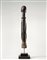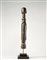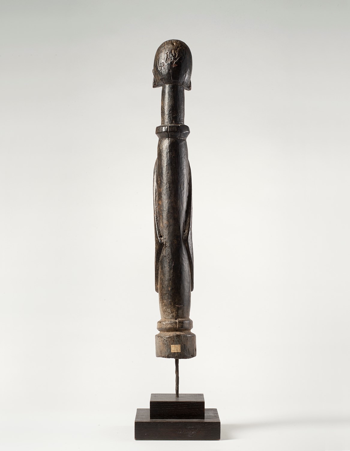 Figura filiforme stilizzata con tronco a mezzo busto su base circolare. Corpo slanciato con braccia lungo il tronco, ombelico presente, viso appena segnato da elementi geometrici, tracce di sostanze sacrificali.