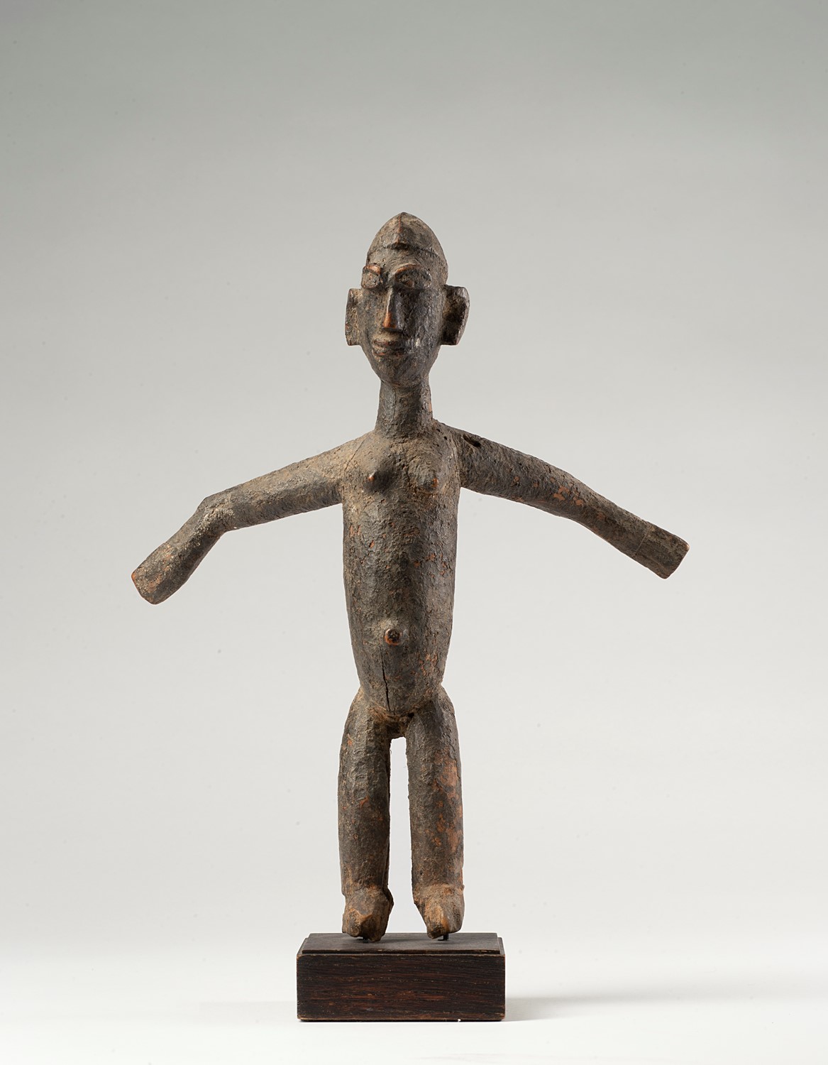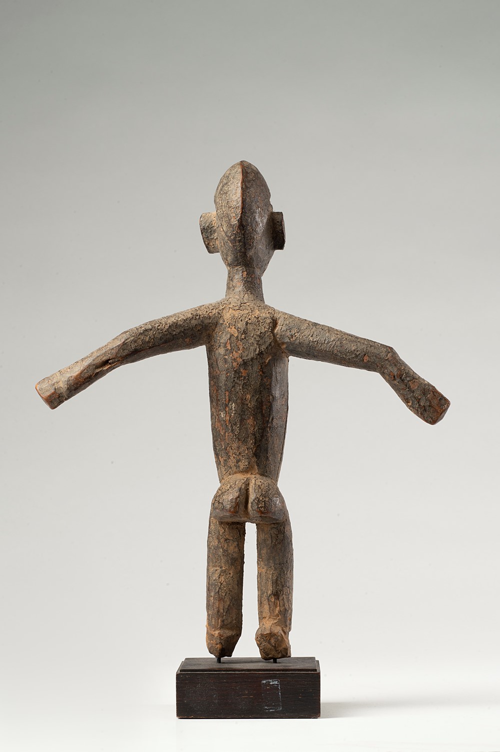 Il corpo, in posizione frontale, è ripreso con braccia aperte: un atteggiamento insolito difficile da eseguire. Tutta la superficie del legno è ricoperta con una densa patina crostosa di colore scuro, una caratteristica dei pezzi più antichi. I piedi sono consumati per il lungo contatto con il terreno umido del santuario familiare sotterraneo dove erano custodite le sculture sacre.