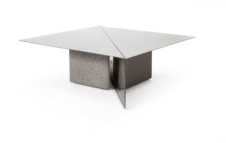Tavolino in acciaio inossidabile con base costituita da due blocchi di calcestruzzo stampato.