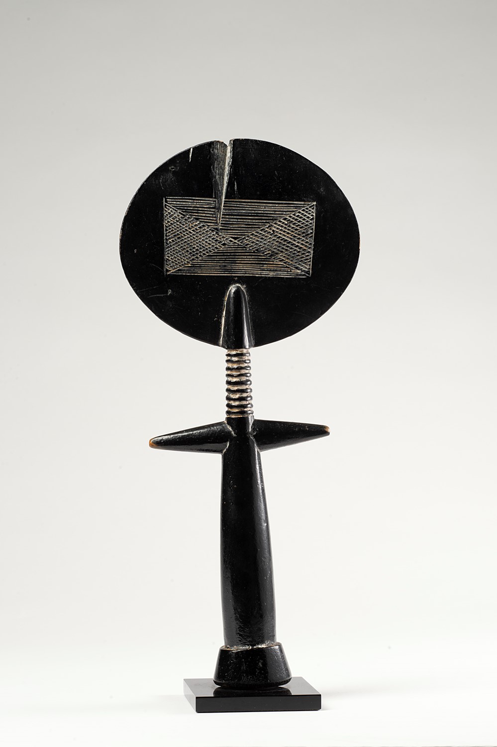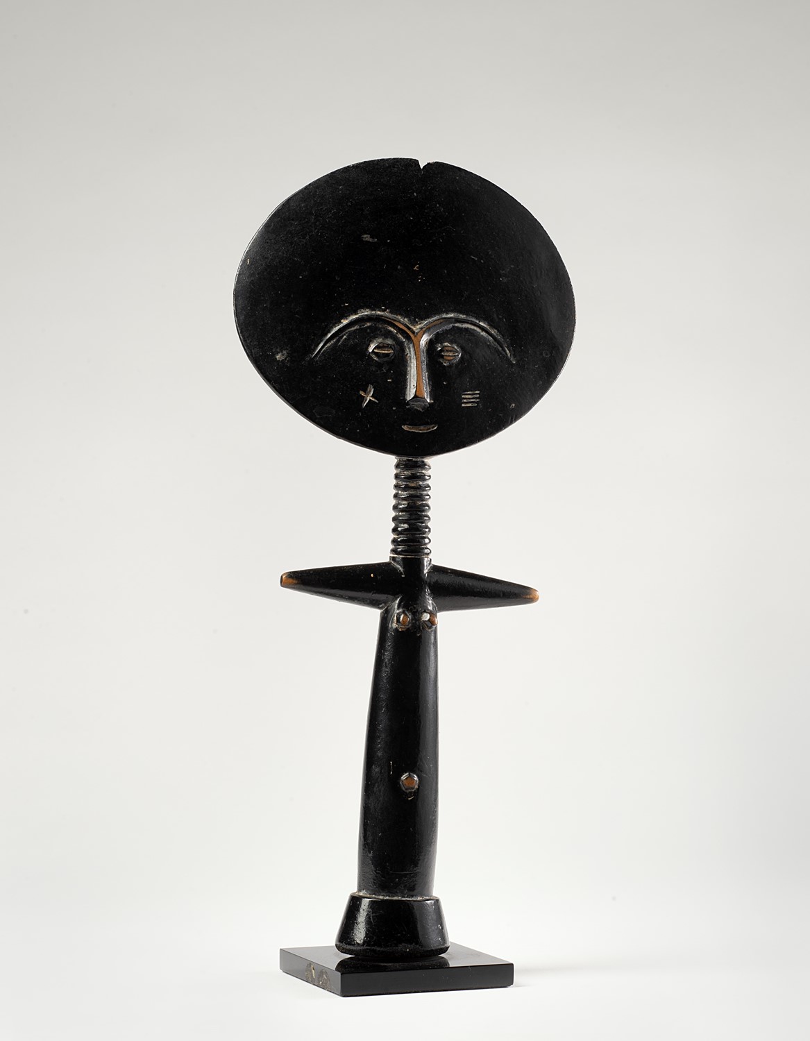 Collezionata in Ghana da Mario Fantin nei primi anni ’60, quest’opera manifesta tutta la sintesi di una forma classica scolpita magistralmente. La sagoma è eseguita con proporzioni perfette di tutte le parti anatomiche. Sulle gote si vedono i due tatuaggi - differenti tra loro - che indicano il clan di appartenenza della proprietaria. Disegni geometrici sul retro.I segni chiari della patina, evidenti nei punti di sfregamento, testimoniano un utilizzo prolungato.