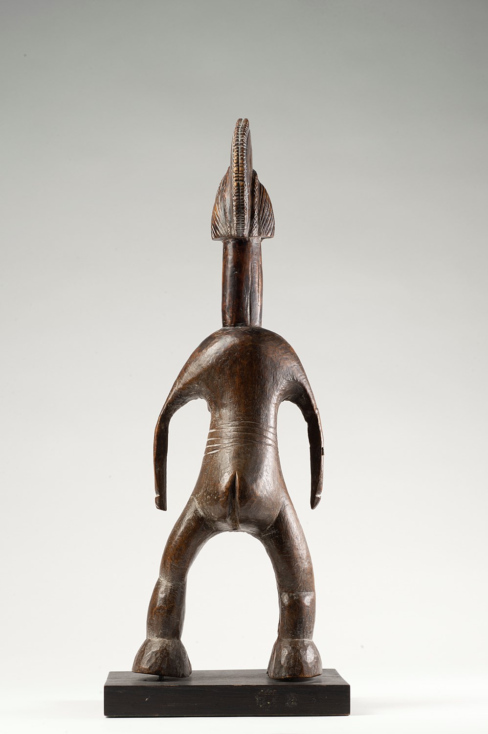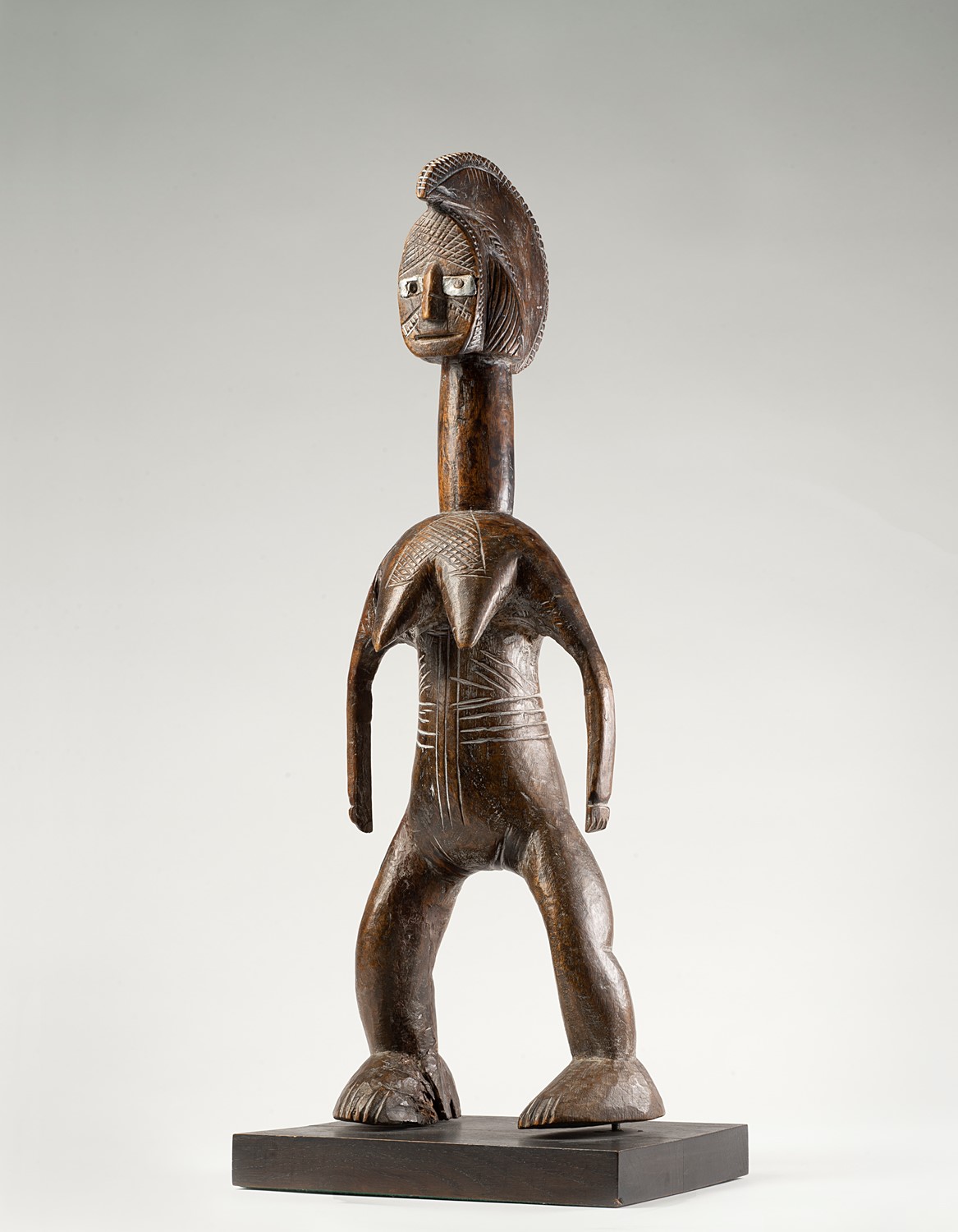 Scultura femminile, in posizione frontale, scolpita in modo simmetrico con braccia staccate dal corpo. Tutte le parti anatomiche come collo, braccia, seni, gambe e piedi, dilatano la figura umana. La testa è segnata da un’elaborata pettinatura a cresta centrale. Dall'ovale del viso piatto si staglia la sagoma del naso. Gli occhi sono evidenziati da rettangoli di alluminio fissati con chiodi di ferro. Nelle varie parti del corpo è presente un impasto di polvere bianca.Raro esemplare che proviene dai territori del Dekina District nella Nigeria meridionale.Gli Igala sono insediati nella zona di confluenza tra i fiumi Niger e Benue, in una vasta area della sponda sinistra del fiume Benue.