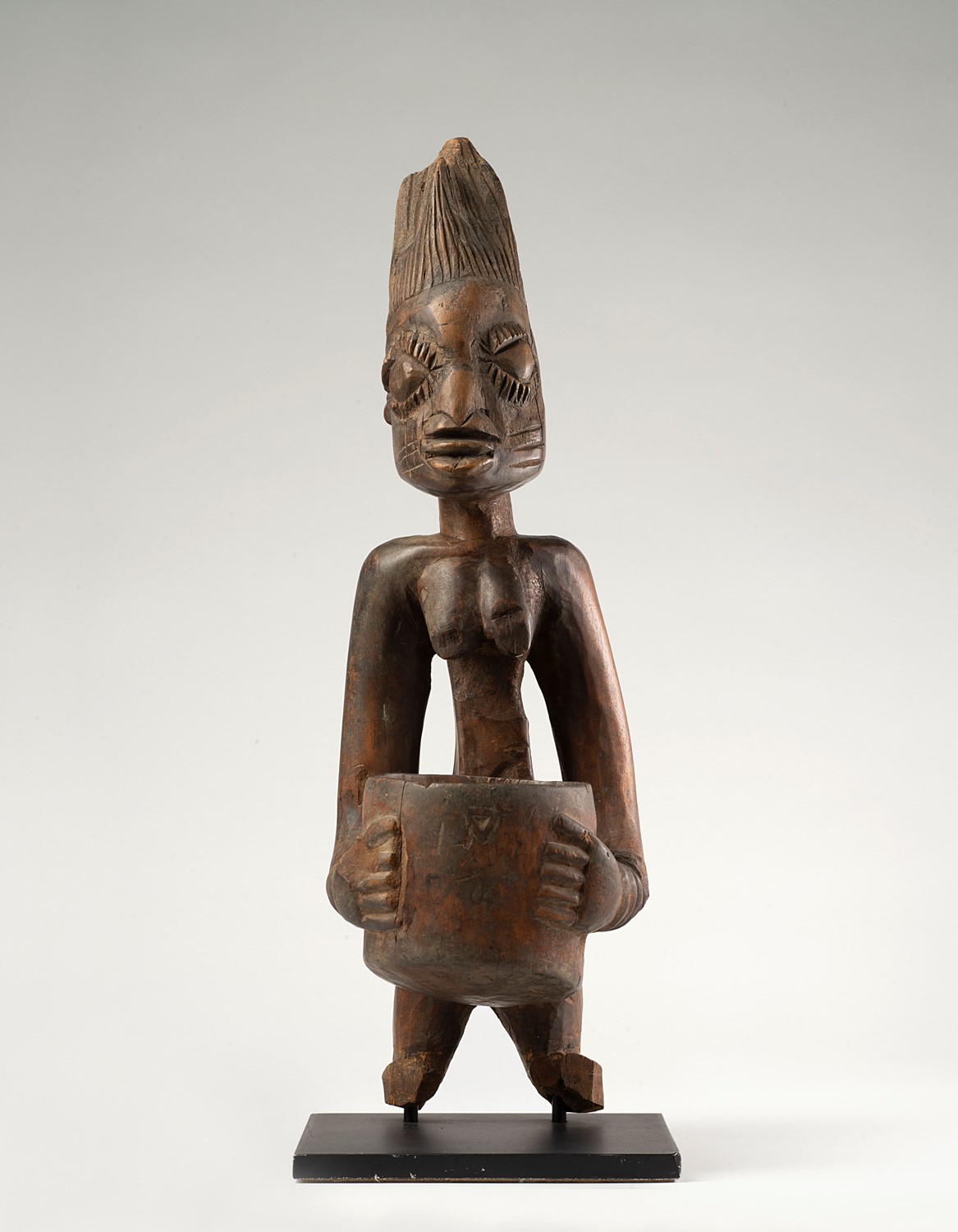 L’immagine della donna è uno dei temi che ricorre spesso nella scultura Yoruba. La figura femminile mette nella coppa delle offerte per uno degli dei del pantheon Yoruba, mentre lo prega per ottenere da lui pace e concordia.La donna indossa il grande copricapo a mitra tipico delle statue Yoruba. Il viso è curato e riprende i caratteristici tatuaggi delle opere di questo gruppo, mentre lo scultore ha dato maggior importanza al grosso vaso rituale che la donna regge con le grandi mani.Quest’opera, scolpita senza preziose rifiniture, è un’interpretazione arcaica degli stili tradizionali Yoruba.