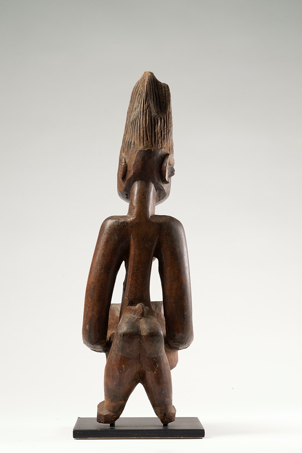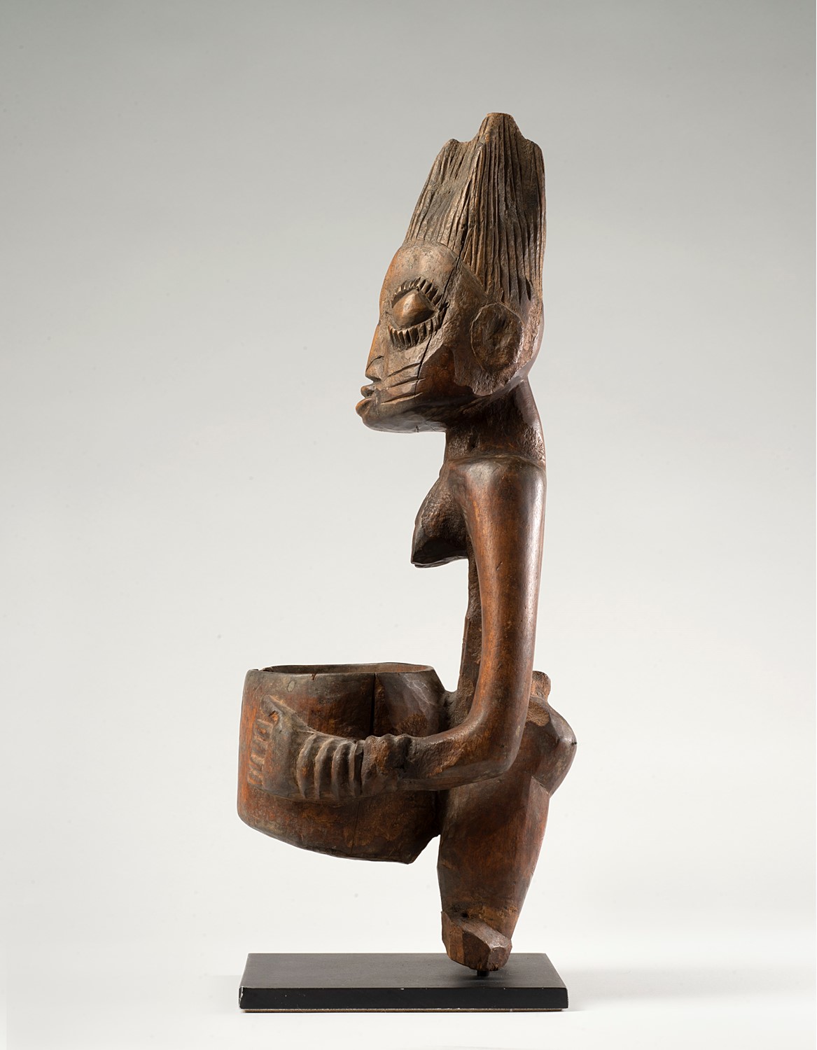 Rappresenta un personaggio femminile che tiene tra le mani un grosso vaso di legno.E’ un oggetto di prestigio che apparteneva ad un capo spirituale Yoruba. Era conservato in un luogo riservato alle pratiche divinatorie del culto di Ifa. La densa patina che ricopre la superficie del legno ne testimonia un utilizzo prolungato.