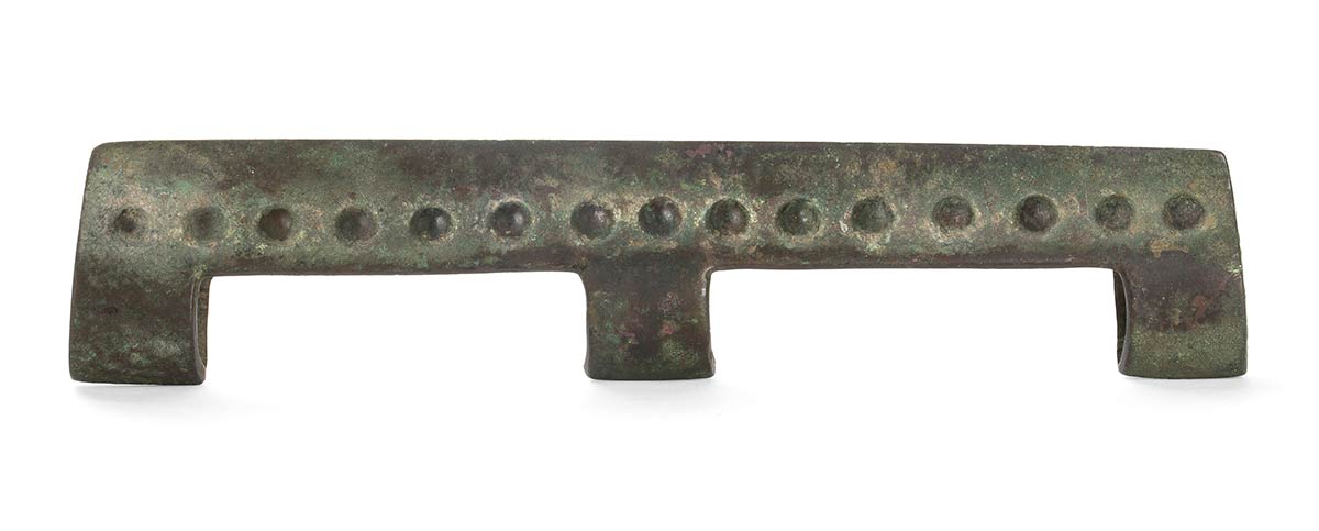 L'oggetto si costituisce di lama piatta lungo la quale si svolge una sequenza di umboni a rilievo, sul lato opposto tre cilindri per il passaggio della presa probabilmente in legno.