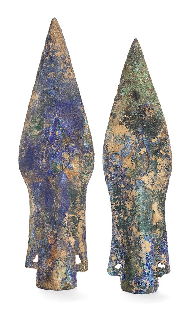 DUE PUNTE DI LANCIA IN BRONZO CON AZZURRITE, MAO