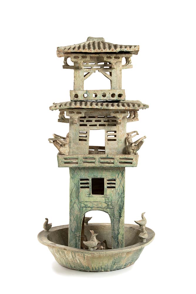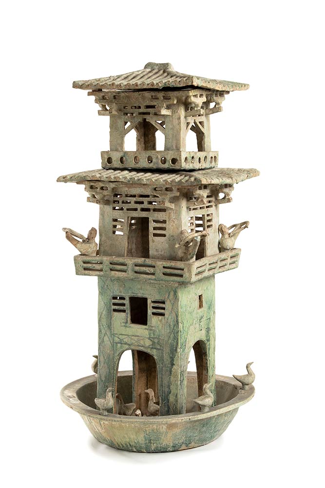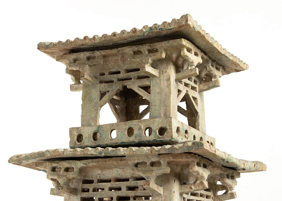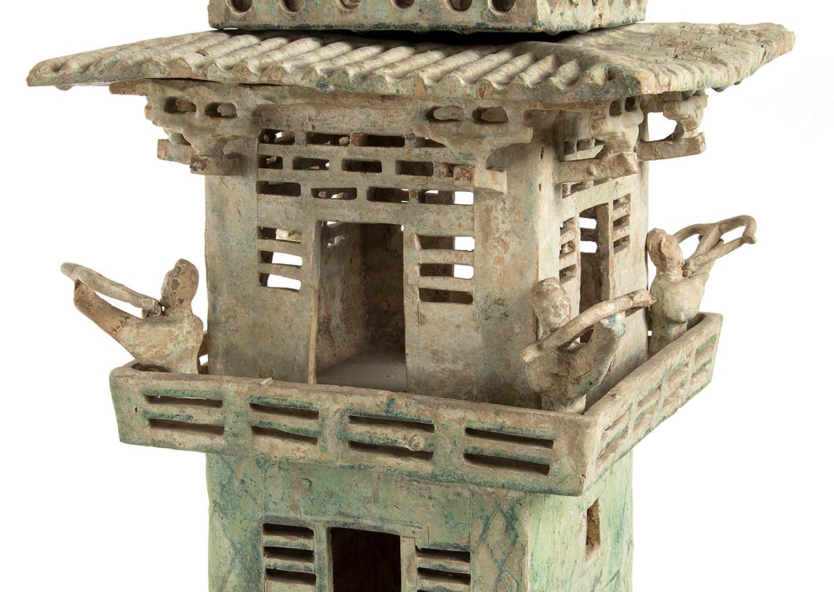 Sebbene fosse già in voga durante gli Han Occidentali, l'uso di interrare nelle tombe modelli di architetture di vario genere divenne largamente diffuso durante gli Han Orientali. Fu allora che l'amministrazione centrale diede una rilevante autonomia alle grandi famiglie, le quali presero a cintare di mura i loro enormi possedimenti, erigendo in punti sensibili delle recinzioni imponenti torri, nella struttura complessiva simili a questo modello in ceramica, con i piani superiori occupati da vedette armate. Nei secoli successivi, queste torri avrebbero ispirato l'erezione delle pagode nei templi buddhisti. Modelli di torre simili a questi sono stati ritrovati in un certo numero nella provincia dello Henan (J.-P. Desroches, Compagnons d'éternité, Parigi 2001, pp. 67-69, a proposito di una torre dalla struttura simile nel Musée national des Arts asiatiques-Guimet di Parigi).