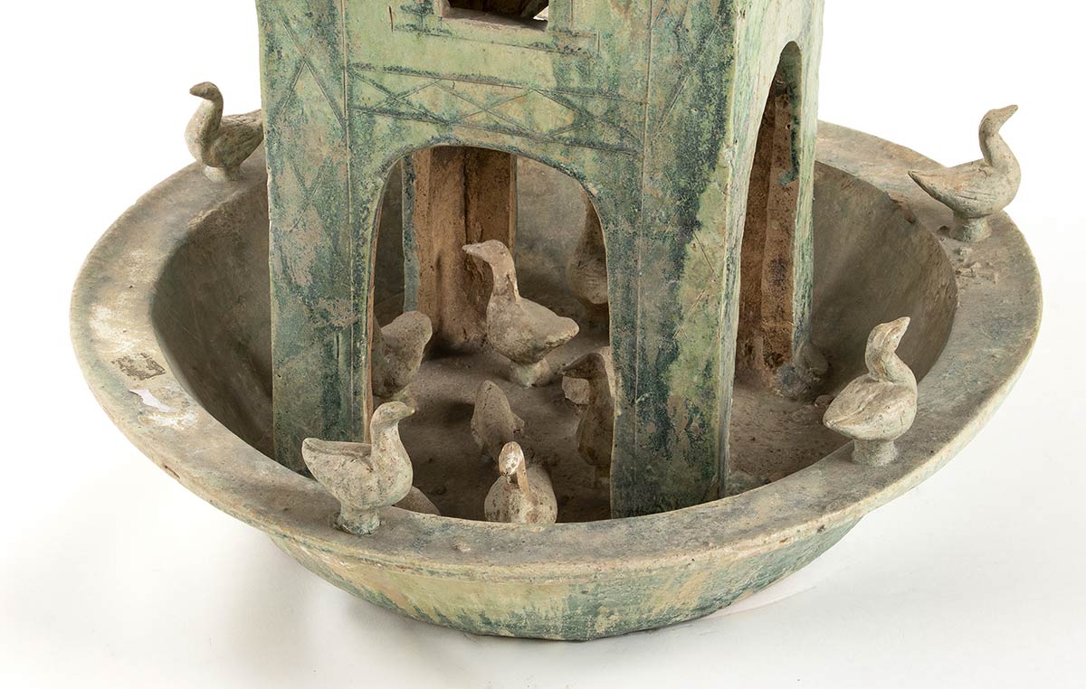 L'imponente struttura – in tre pezzi - si compone di una grande ciotola dalla parete arrotondata che costituisce la base, sulla quale si posa un primo piano con larghe finestre e strette aperture orizzontali, sul seguente terrazzamento si situa un altro ambiente coperto da tetto a tegole, e infine ancora un altro più piccolo spazio anch'esso protetto da tetto spiovente, i due piani superiori caratterizzati da complessa costruzione di sostegno, sulla ciotola inferiore – che evidentemente simula la presenza di uno stagno - oche e pesci a tutto tondo, nei quattro angoli del terrazzamento al primo piano altrettanti soldati con balestra puntata, l'intera superficie esterna rivestita di invetriatura verde che assume in certi punti iridescenze argentee.
