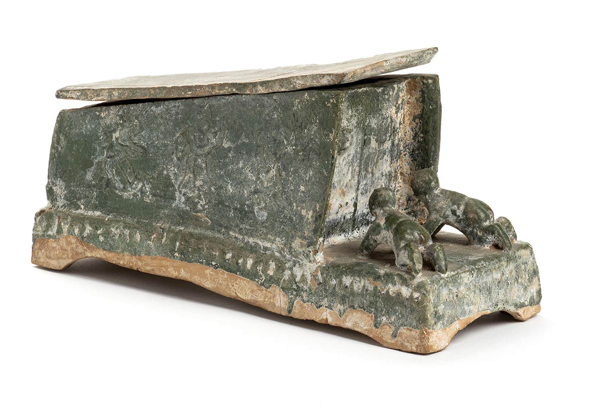 La scultura raffigura quello che sembra essere un modello di tomba a sezione rettangolare con copertura mobile inclinata, le pareti più lunghe con figure stanti a linee rilevate, sul patio di fronte all'ingresso due figure a tutto tondo prostate in atteggiamento di preghiera, la superficie esterna rivestita di spessa invetriatura verde, la base non invetriata.