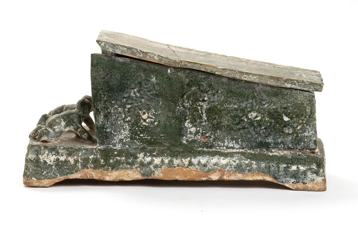 SCULTURA FUNERARIA DI MODELLO DI TOMBA CON FIGURE ORANTI IN CERAMICA INVETRIATA<br>Cina, probabilmente dinastia Han