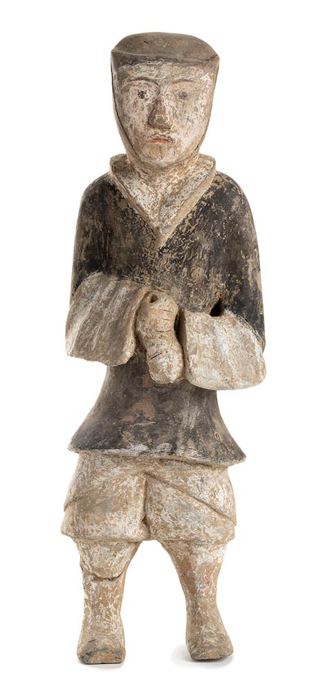 SCULTURA FUNERARIA DI ALFIERE STANTE IN CERAMICA DIPINTA<br>Cina, dinastia Han