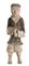 La figura stante in posizione frontale, vestita di giacca lunga allacciata in vita e ampi calzoni sugli stivali, le mani giunte all'altezza del ventre a trattenere l'asta dello stendardo, i dettagli del viso dipinti con cura in rosso e nero.