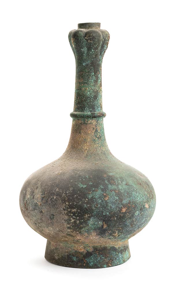 BOTTIGLIA DA VINO CON BOCCA 'A TESTA D'AGLIO' IN BRONZO<br>Cina, dinastia Han Occidentali