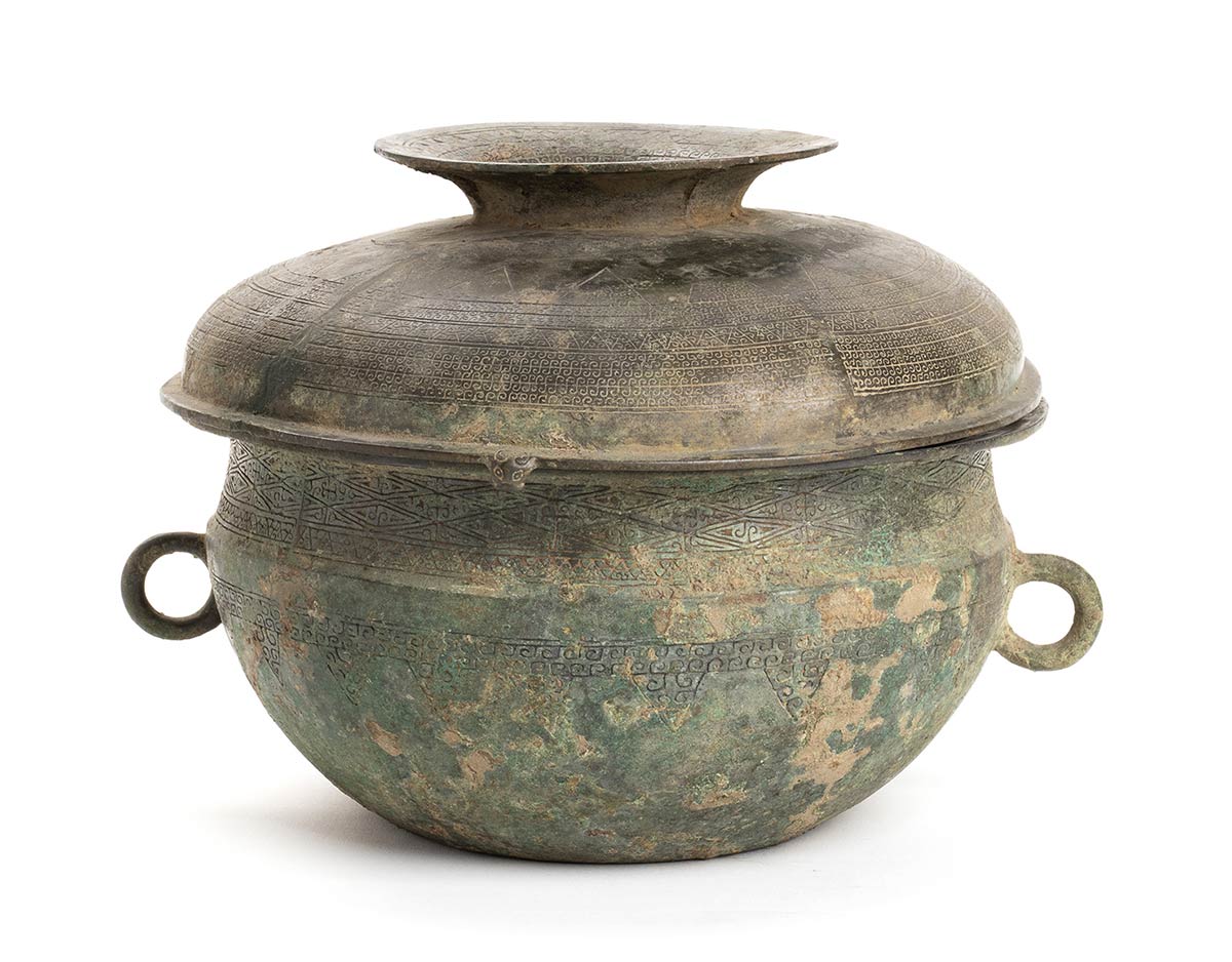 CONTENITORE RITUALE CON COPERCHIO PER SERVIRE GRANO IN BRONZO, DUI<br>Cina, dinastia Zhou Orientali, V-III secolo a.C.<br>