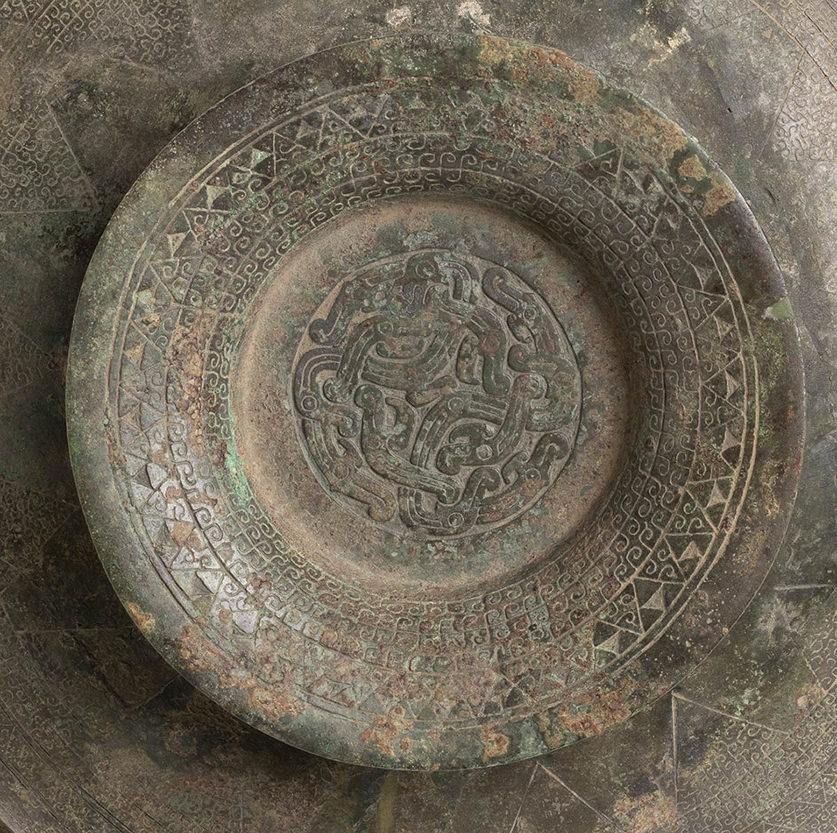 Il grande recipiente emisferico sormontato da coperchio a calotta ribassata con ampia presa circolare, due prese ad anello nei pressi della zona superiore del corpo, l'intera superficie esterna decorata a minuti motivi geometrici disposti entro fasce orizzontali parallele, l'interno della presa del coperchio con un fine motivo di draghi stilizzati.