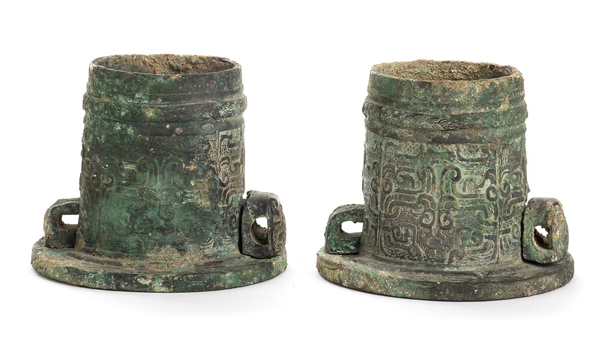 COPPIA DI MOZZI DI CARRO CON GANCIO IN BRONZO, DOU<br>Cina, dinastia Zhou Orientali, V-III secolo a.C.