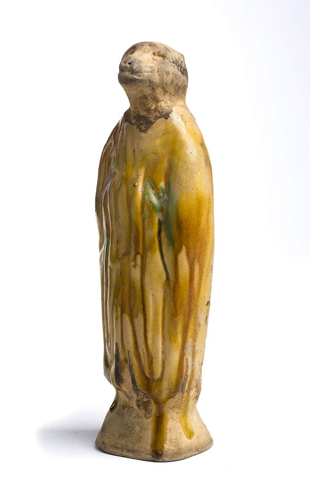 La figura stante con la testa di scimmia, l'abito rivestito di una spessa invetriatura ocra con tocchi di verde.
