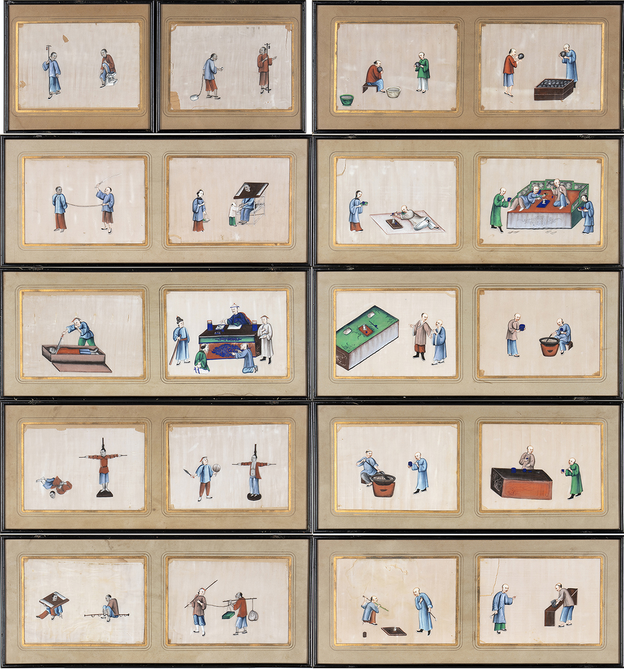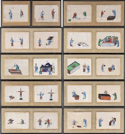 VENTI DIPINTI CON SCENE DI VITA QUOTIDIANA E TORTURE<br>Cina, dinastia Qing, XIX secolo