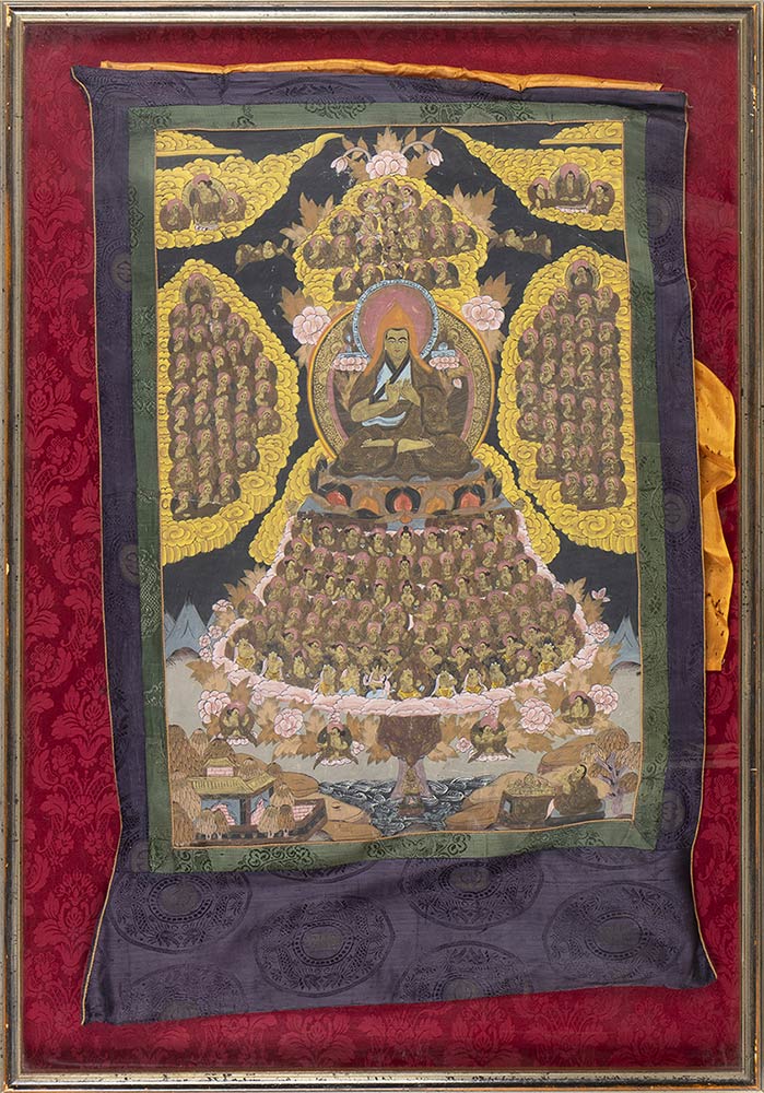 Inchiostro e colori su tessuto, sua cornice in seta, in cornice in legno e vetro protettivo.