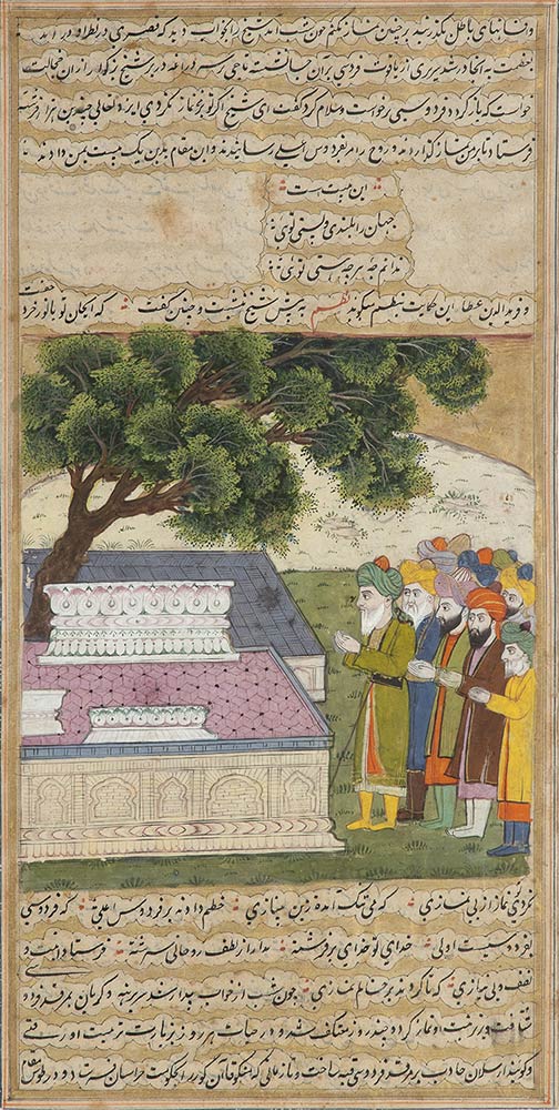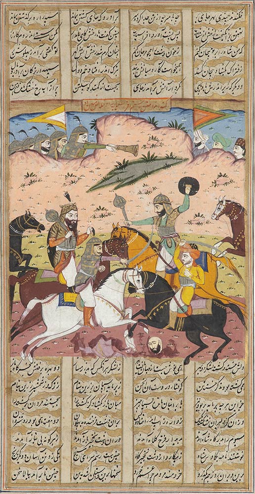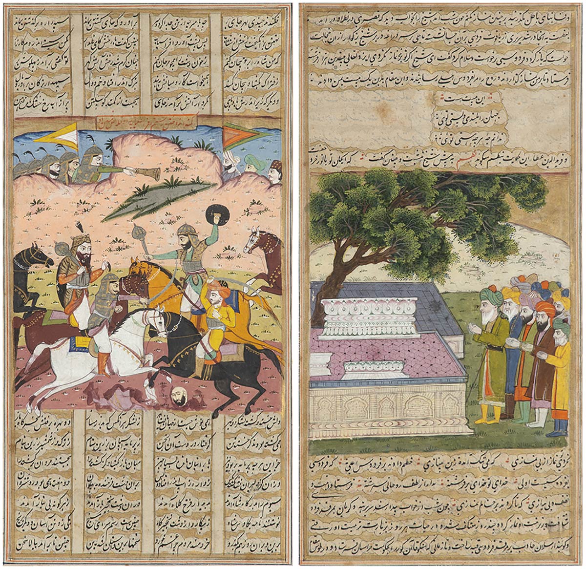Le scene di entrambe le pagine chiuse in alto e in basso da testo, una con un combattimento a cavallo l'altra con un gruppo di uomini in preghiera nei pressi di un mausoleo, cornice in legno e vetro protettivo.
