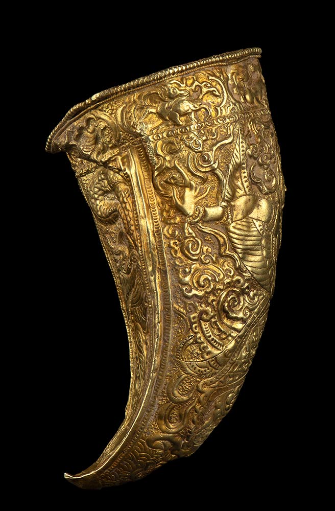 A forma di cornetto, con il lato più ampio ampiamente stondato, la decorazione a rilievo consiste di una divinità con ali e gambe stilizzate, ai lati della quale si dispongono due serpenti mitologici, altre creature fantastiche si vedono anche nella fascia nei pressi della bocca.