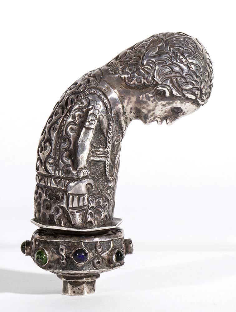 Lavorato a sbalzo con una figura di uomo che mostra caratteri europei, l'anello inferiore arricchito dall'inserto a cabochon di vetri colorati, uno mancante.