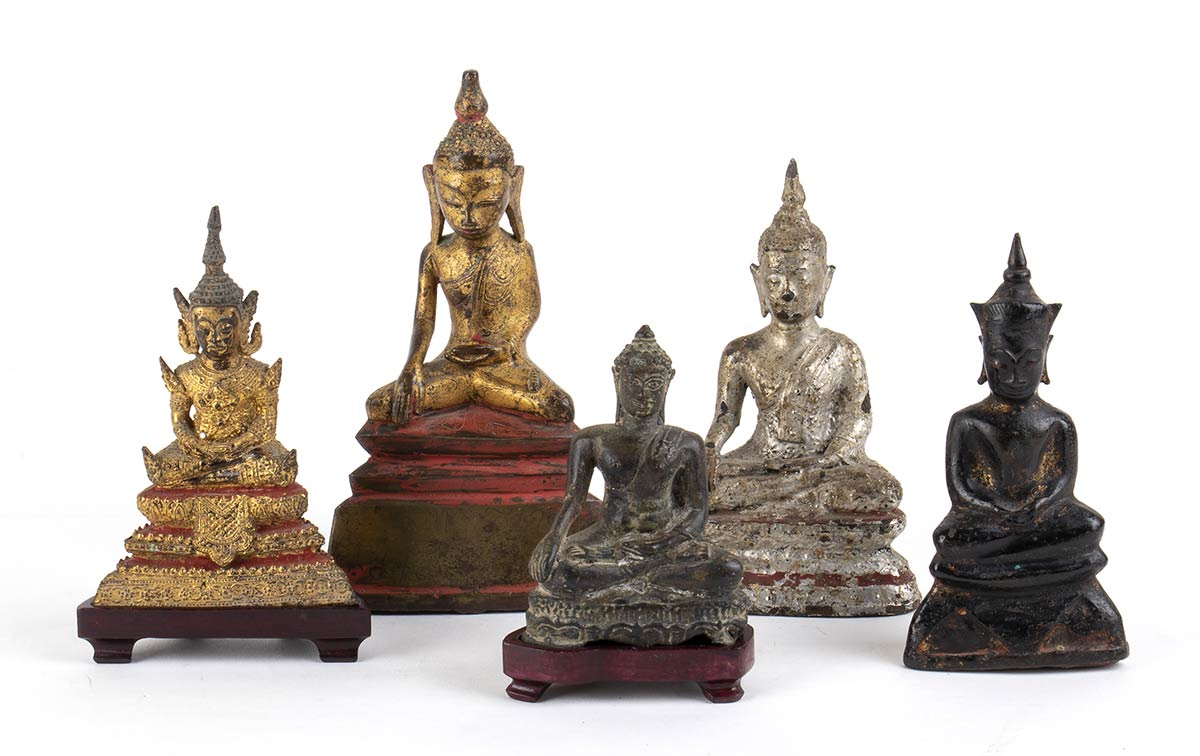CINQUE SCULTURE IN BRONZO DI BUDDHA<br>Sud-Est asiatico, XVII-XIX secolo