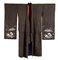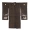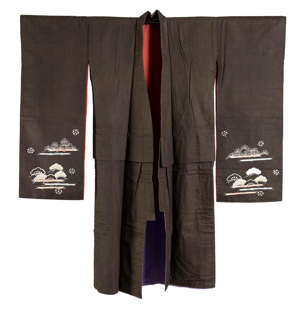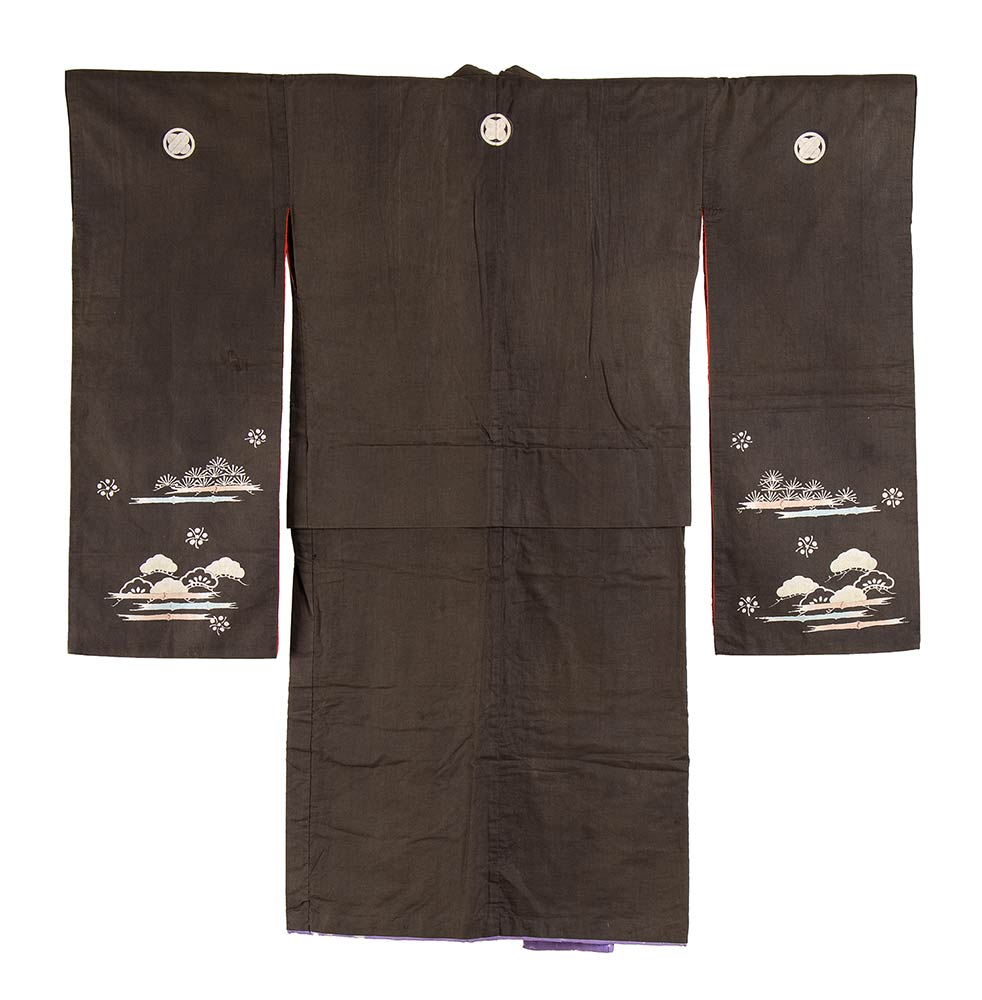 Fondo marrone scuro, con trama fitta e consistente, decorato con motivi beneaugurali di pino e bambù, sul retro in alto emblema araldico (kamon) con due penne incrociate all'interno di cerchio.
