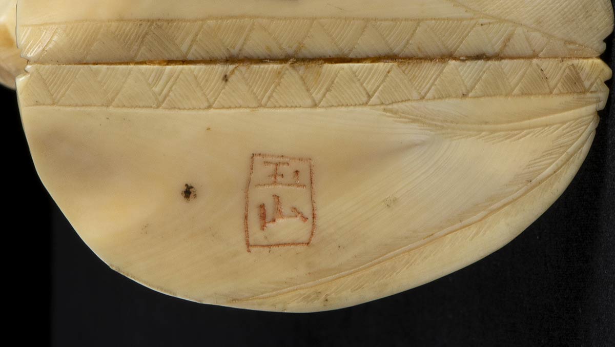 Raffigurato stante su base all'incirca circolare, ai suoi piedi una vanga, con la mano destra sorregge un cesto al cui interno zucche, una zucca anche nella mano sinistra, firmato 玉山 (Gyokuzan).