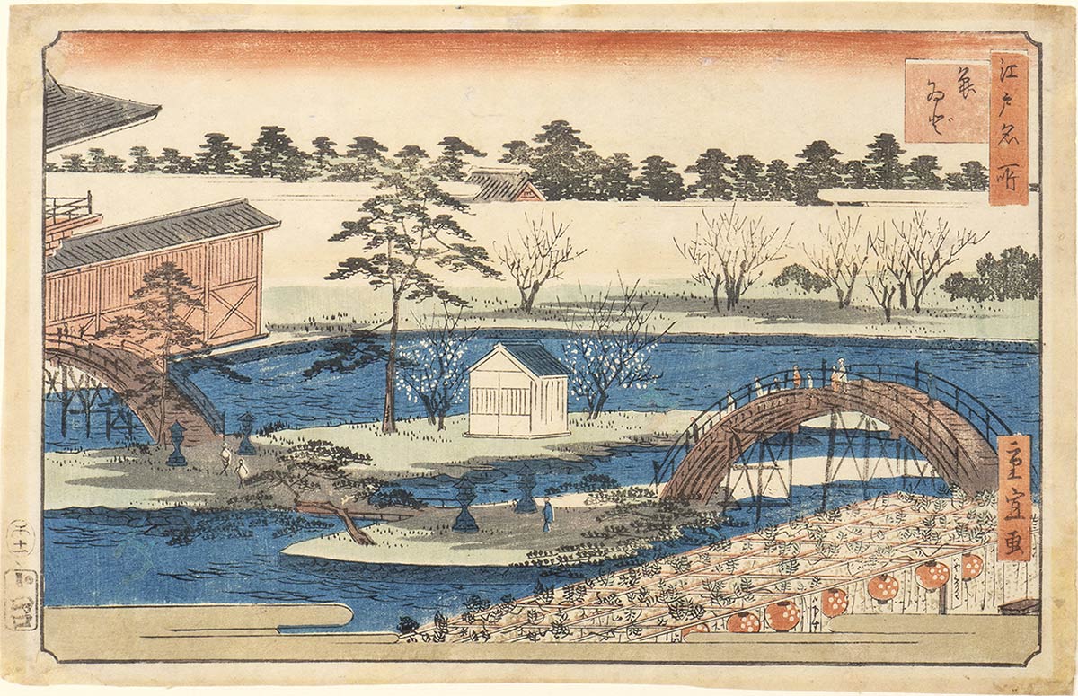 Utagawa Hiroshige II<br>(1826-1869)<br><br>I due ponti gemelli a Kameidō Tenjin, 1859