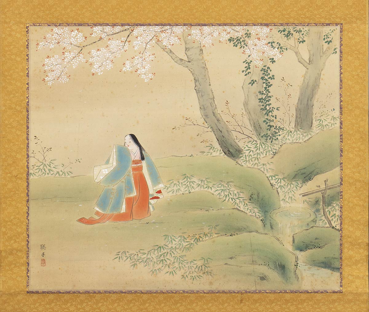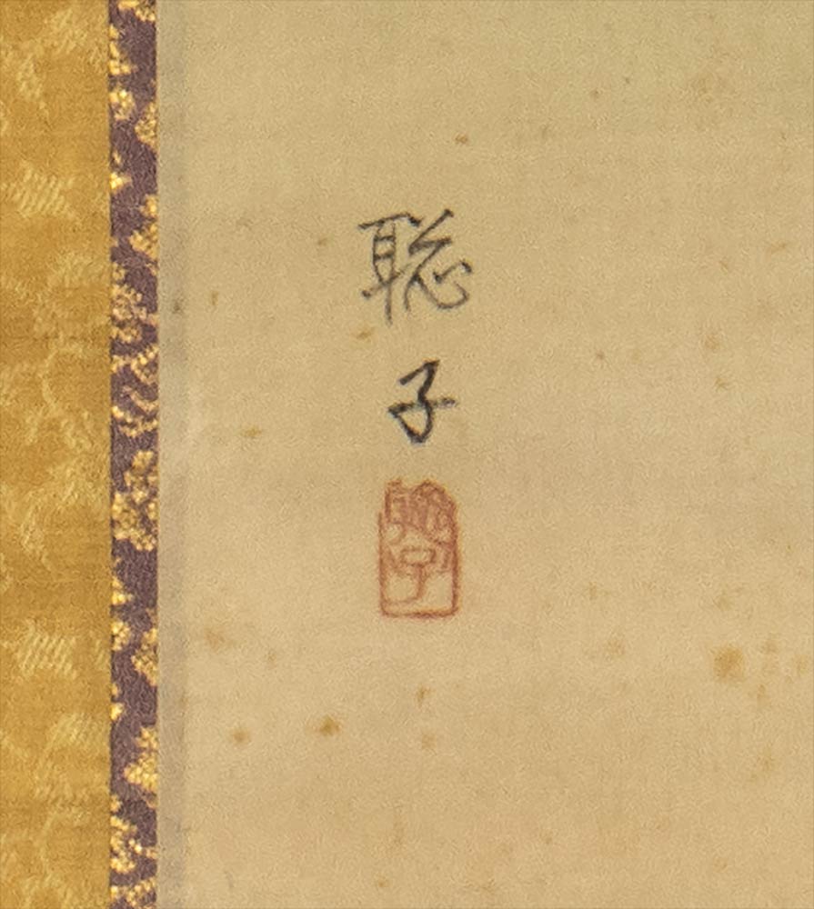 Firmato nell'angolo inferiore sinistro 聡子 (Sōshi) con sigillo; cornice in seta.