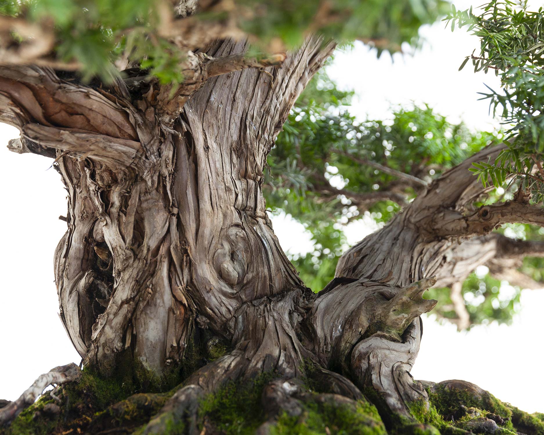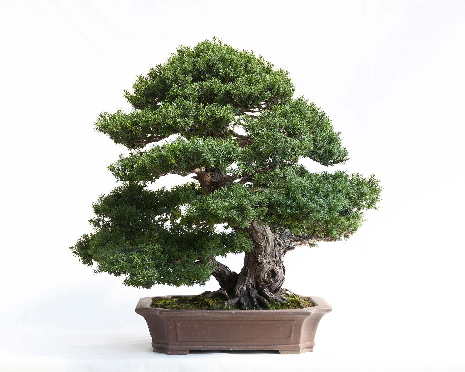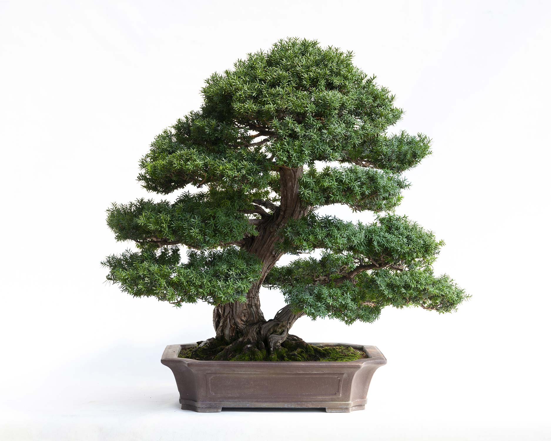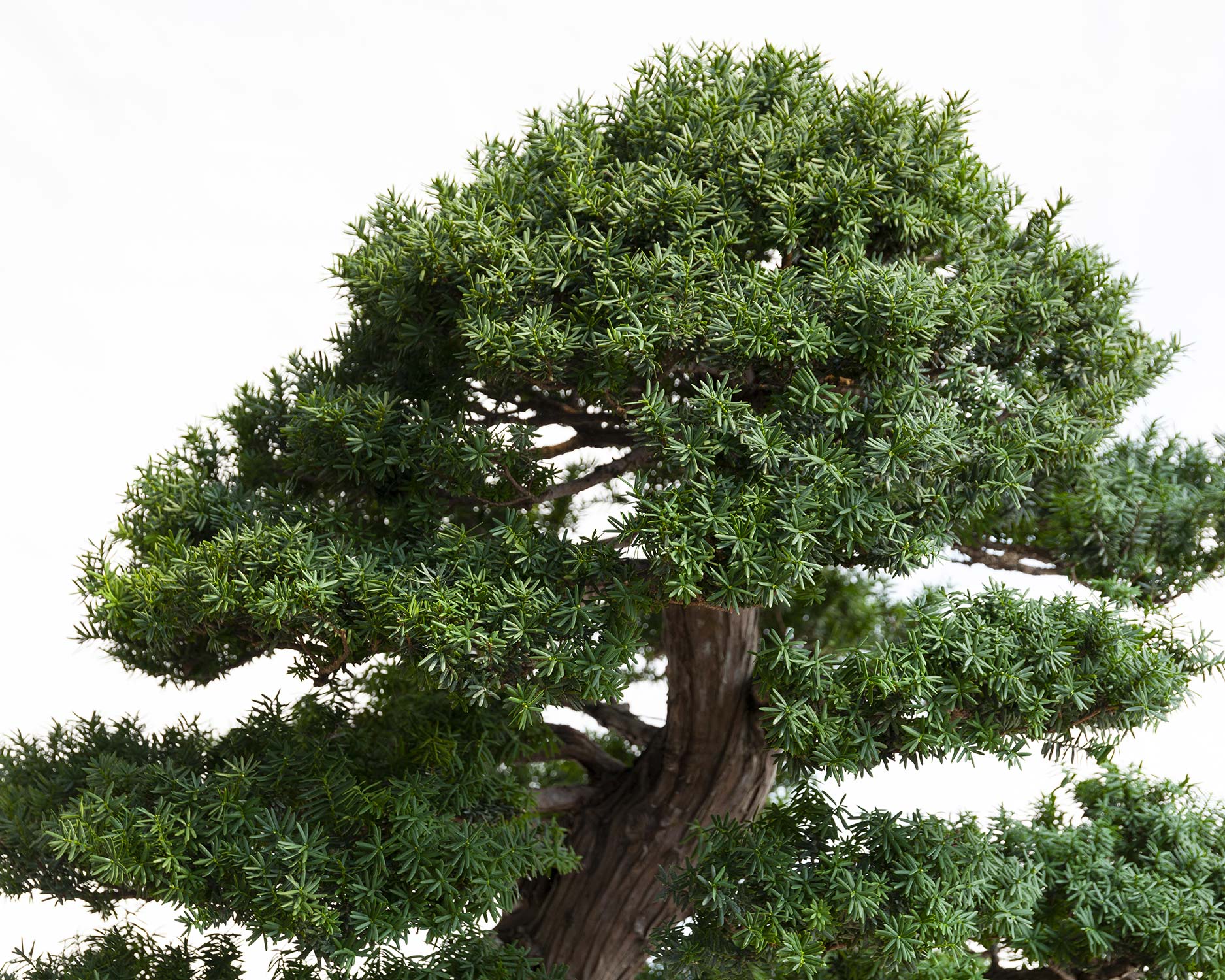 Questo bonsai di Taxus cuspidata proviene dal famoso vivaio Urabe, presso Osaka. Risalta la corteccia scagliosa, che è priva di shari e jin nonostante la maturità, e l'elegante e possente struttura a doppio tronco, sokan, caratteristiche che ne sanciscono l’unicità. Età stimata 100 anni.