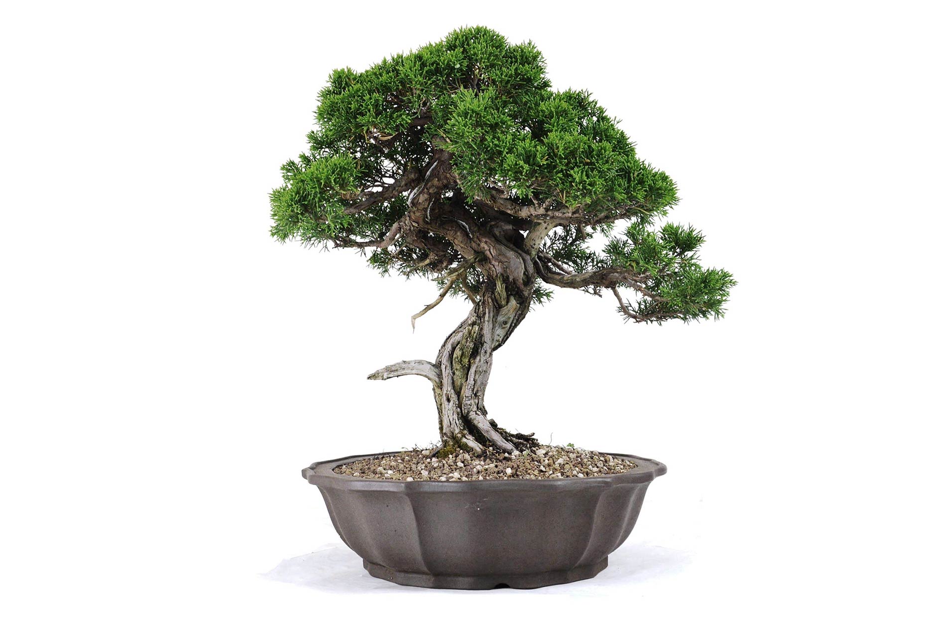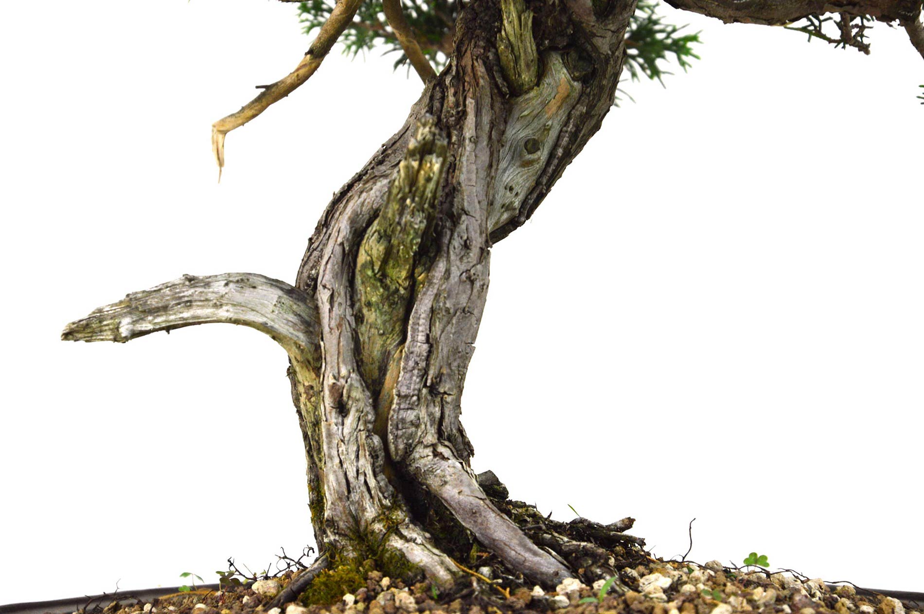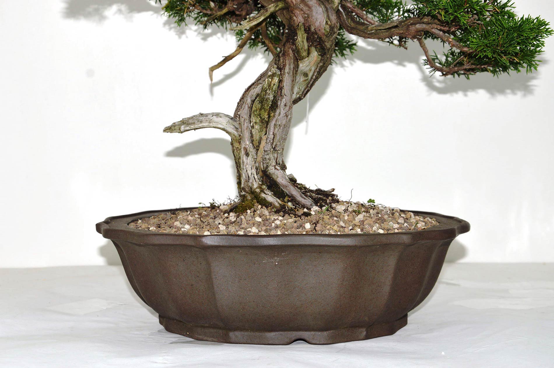 Bonsai di provenienza giapponese in stile eretto informale, caratterizzato dalla contorsione e dallo shari del tronco. Vaso in gres non smaltato a fiore di loto. Età stimata 40 anni.
