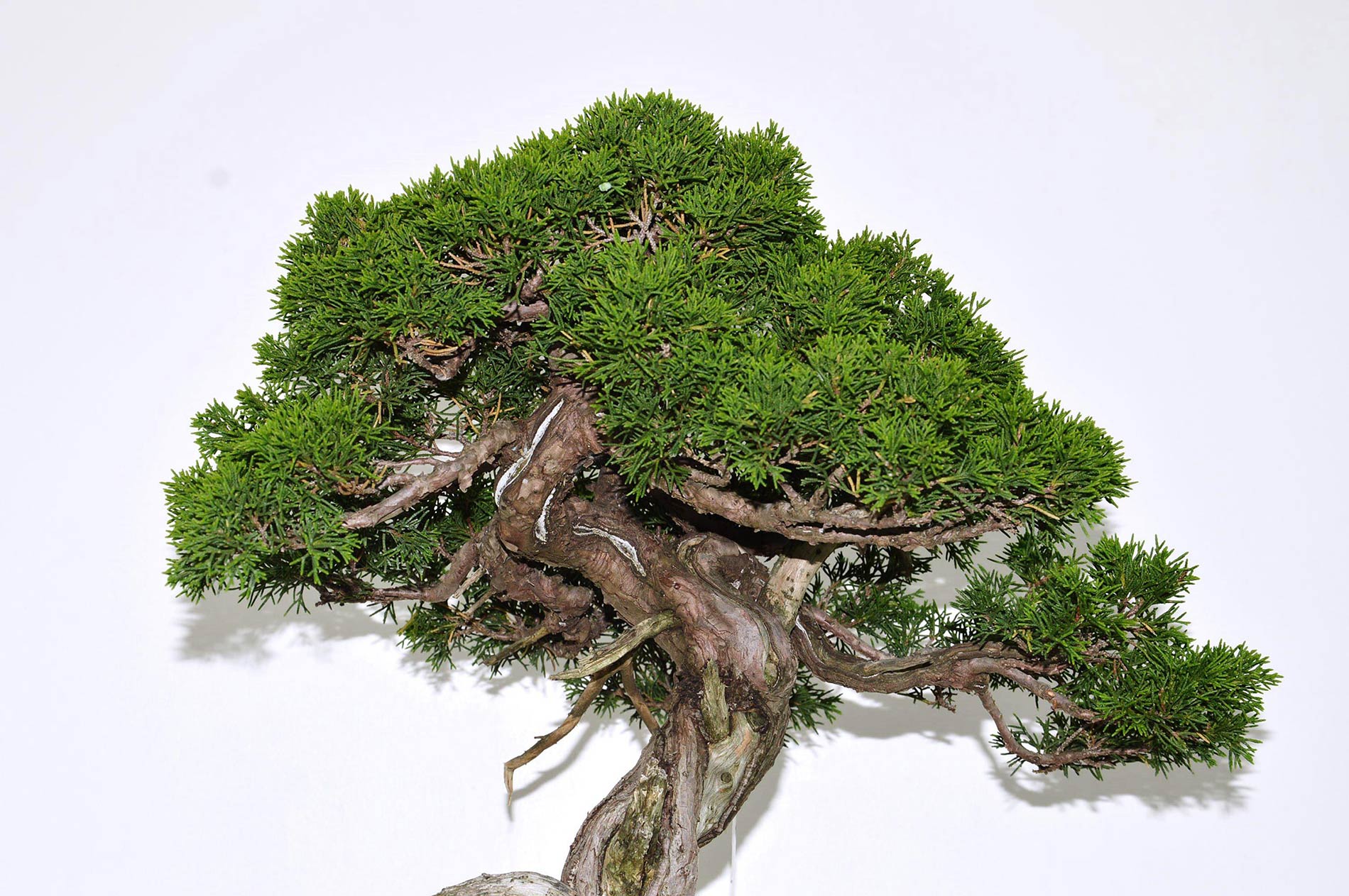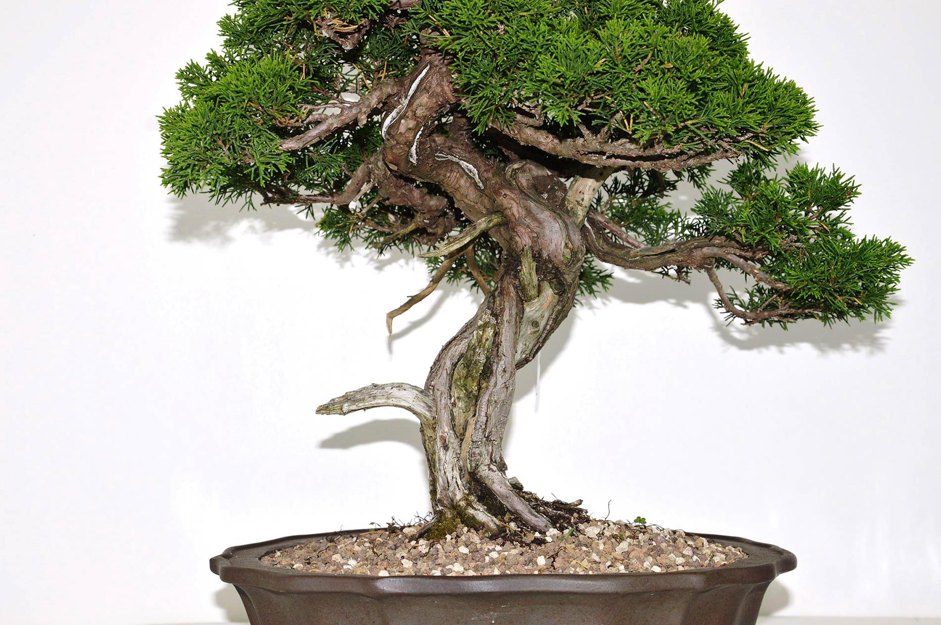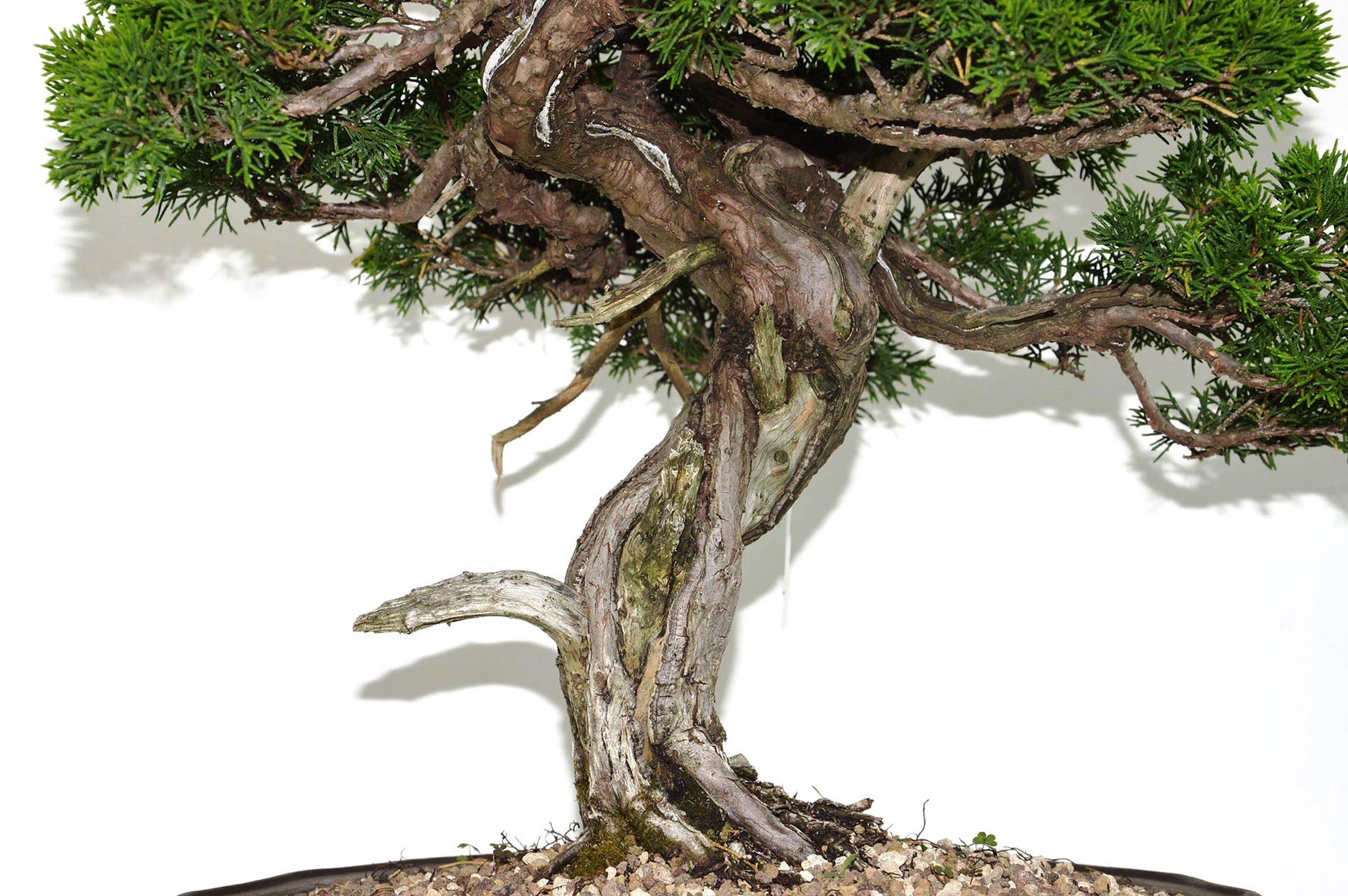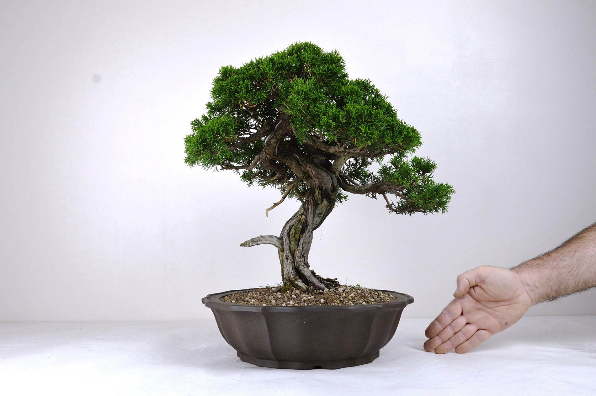 Bonsai di provenienza giapponese in stile eretto informale, caratterizzato dalla contorsione e dallo shari del tronco. Vaso in gres non smaltato a fiore di loto. Età stimata 40 anni.