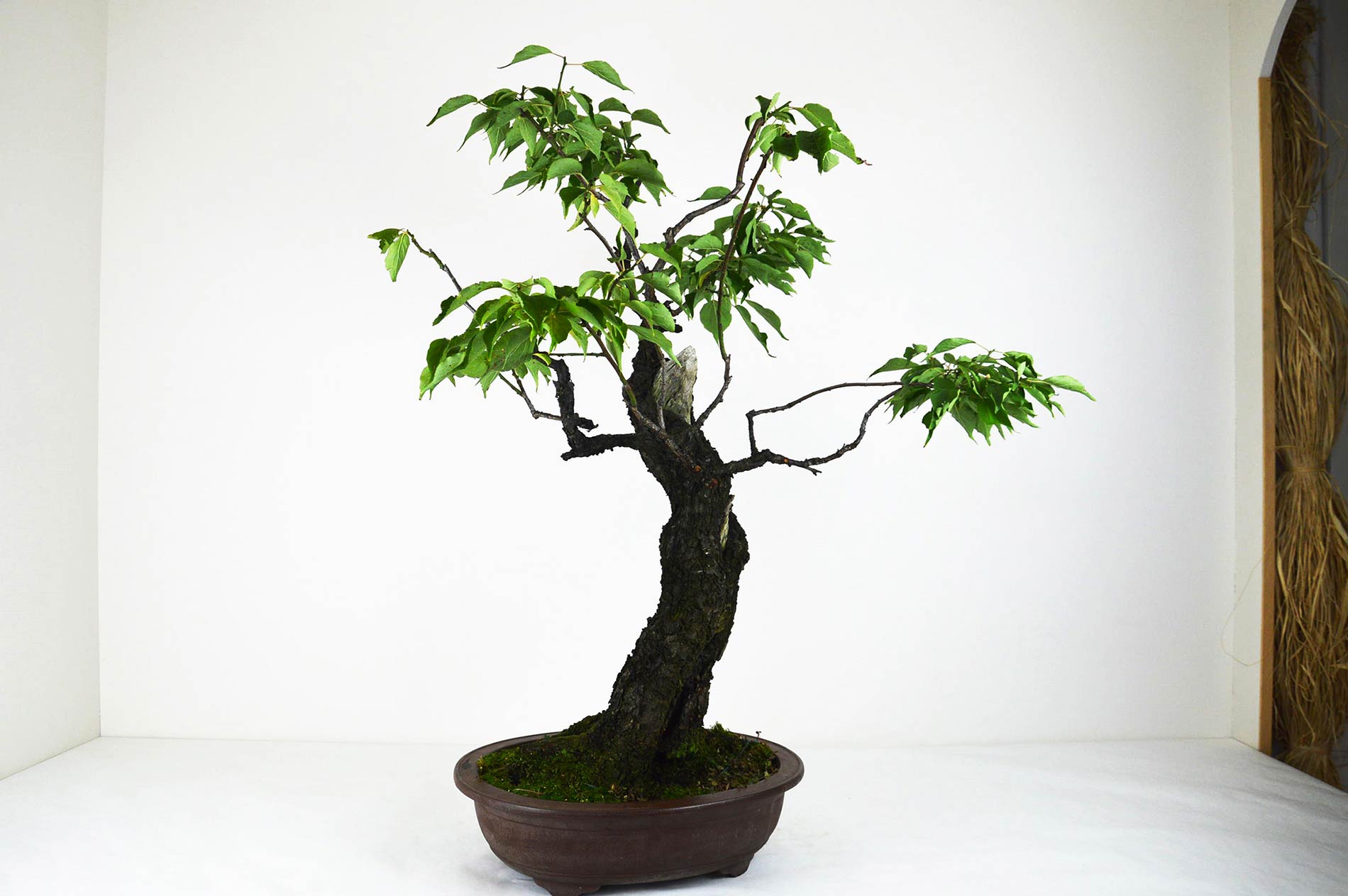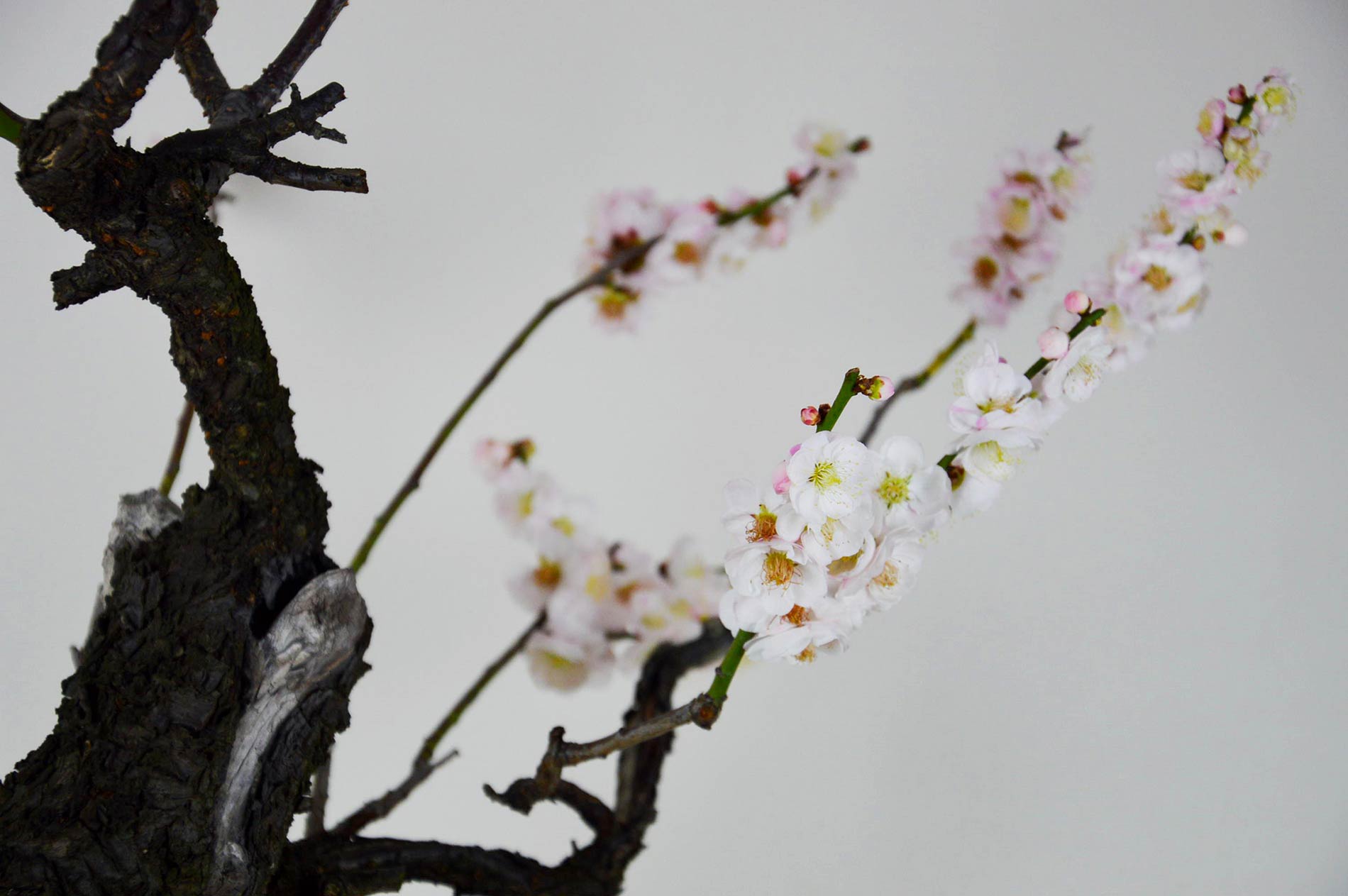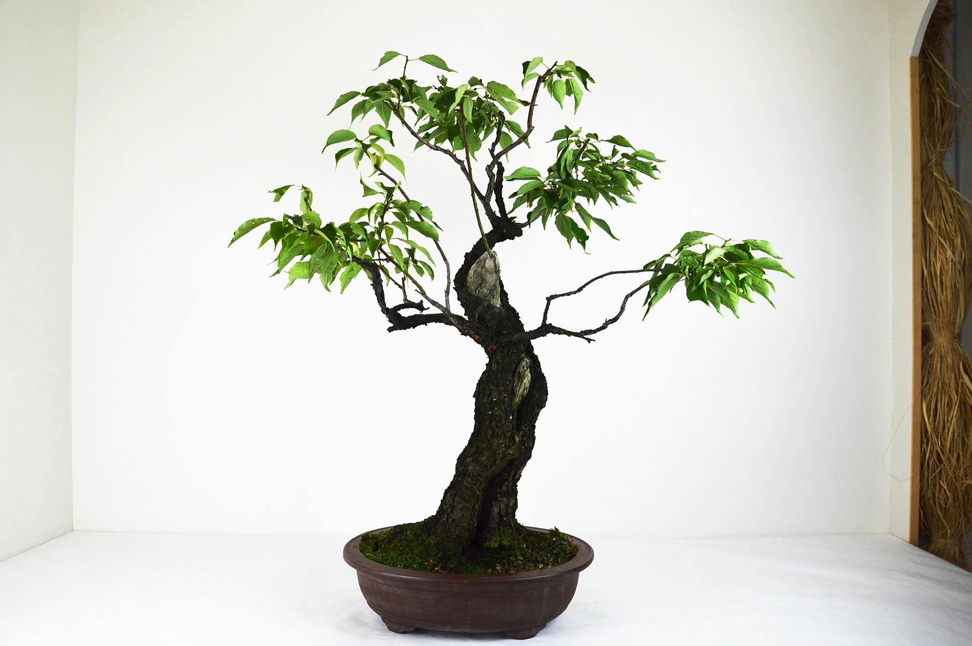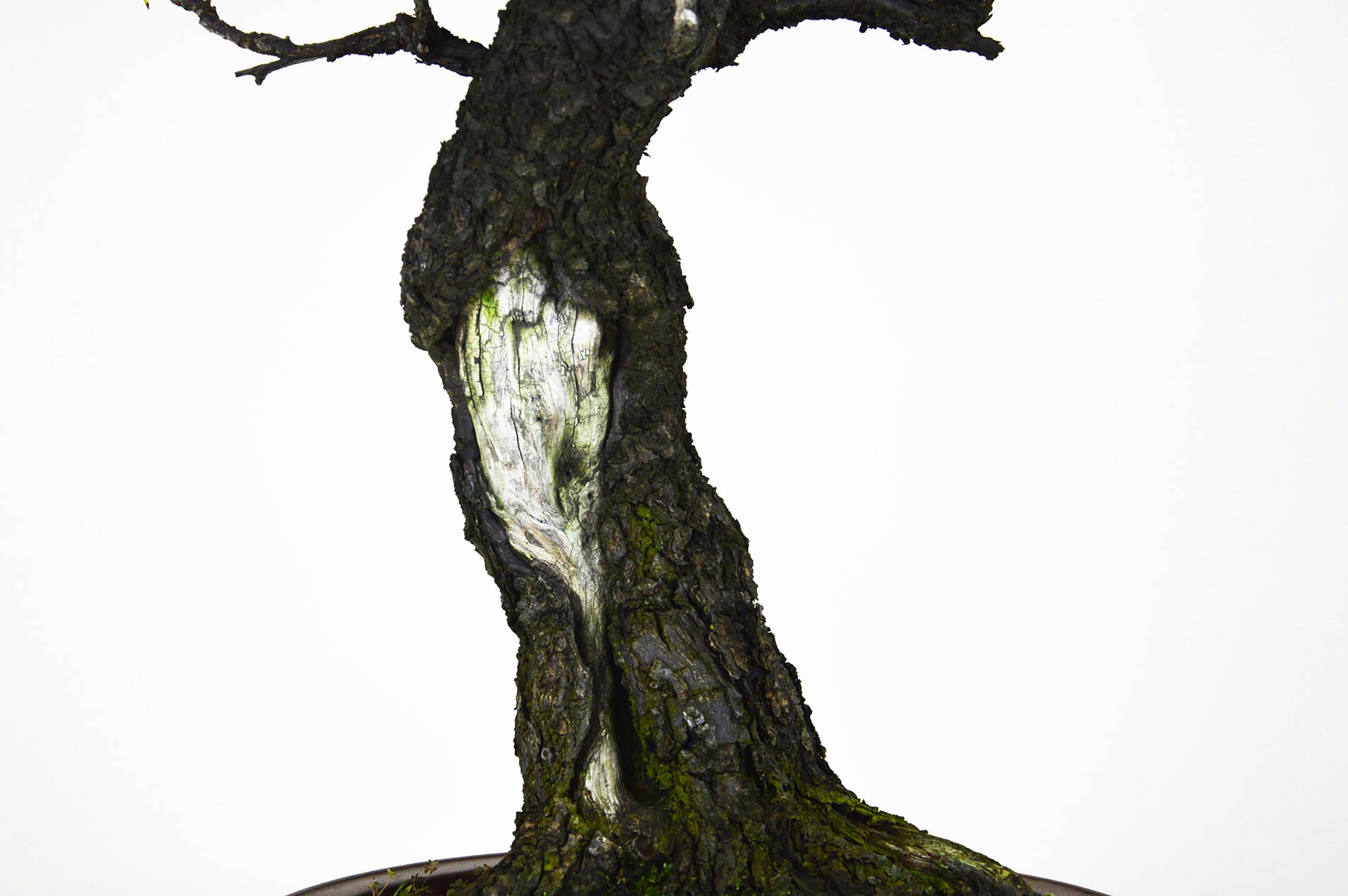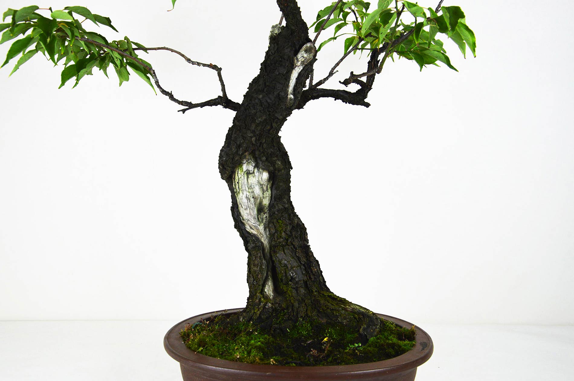 Bonsai di prunus mume "Ume" di provenienza giapponese in stile eretto informale, posto in vaso in gres non smaltato ovale. Età stimata 80 anni.