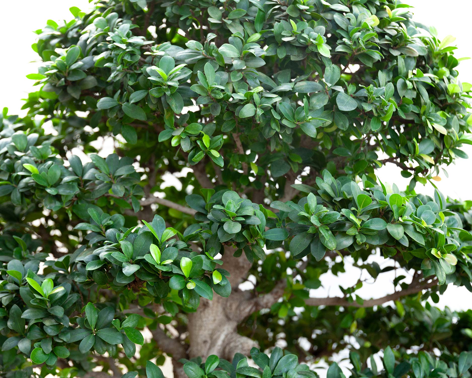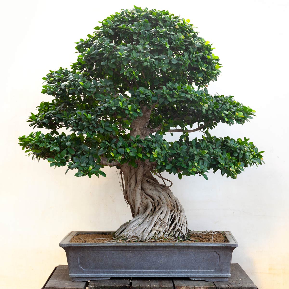 Imponente bonsai che si adatta alla vita all’interno. La è foglia piccola e robusta. Questo esemplare si caratterizza per via del movimento del tronco e della sua vecchia ramificazione. Età stimata 80 anni.