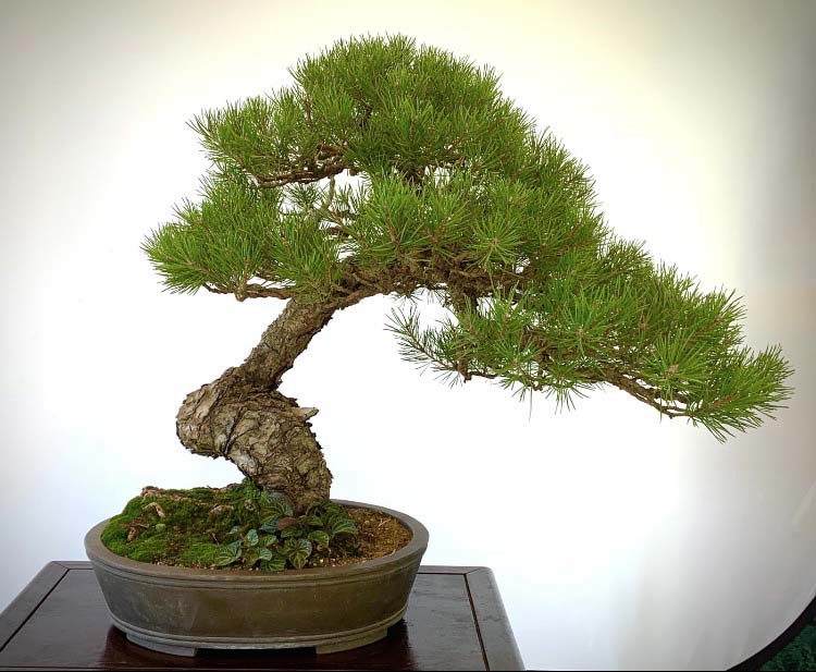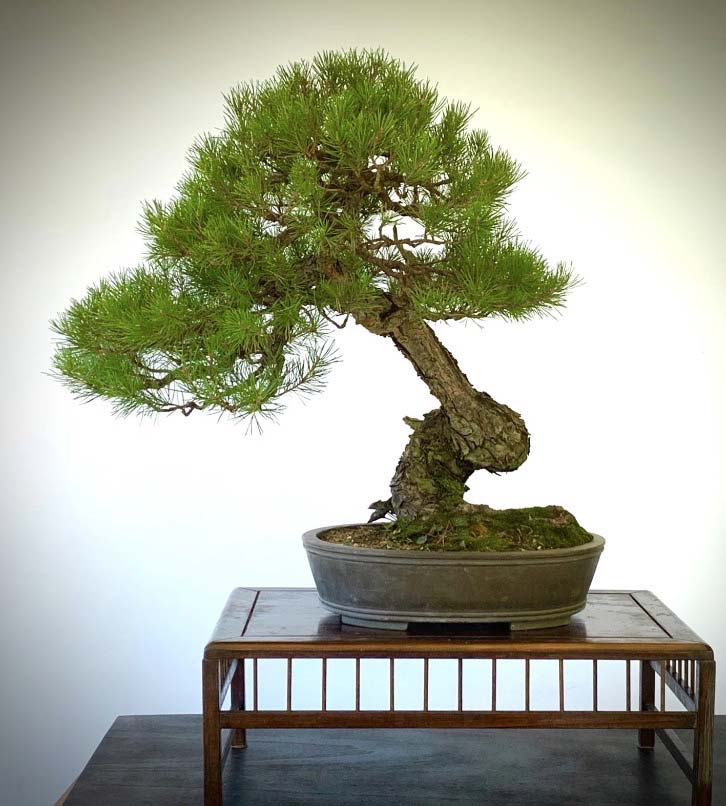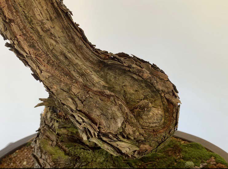 Pino silvestre con tronco inciso di un notevole shari. La direzionalità ampia ed esplicita lo rende ideale per un’esposizione.